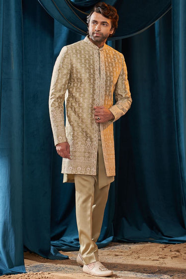 Satin Stunning Chikoo Color Wedding Wear Readymade Men Indo Western With Embroidered Work