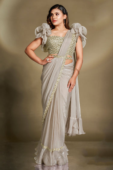Scarlet Beige Satin Silk Ready To Wear Aari Work Saree