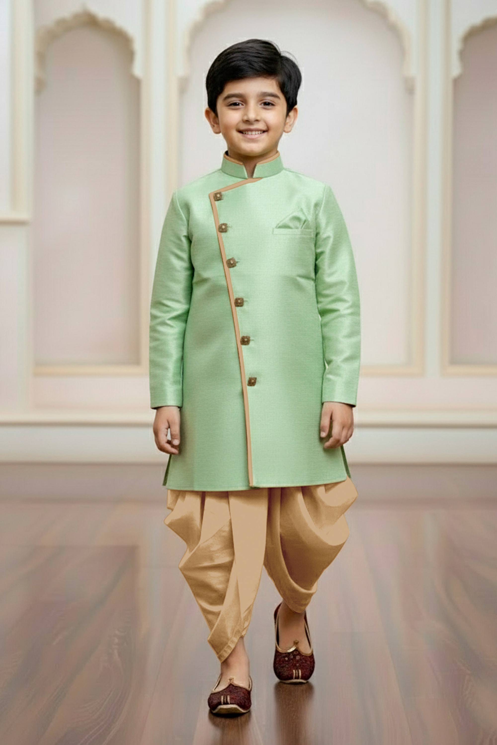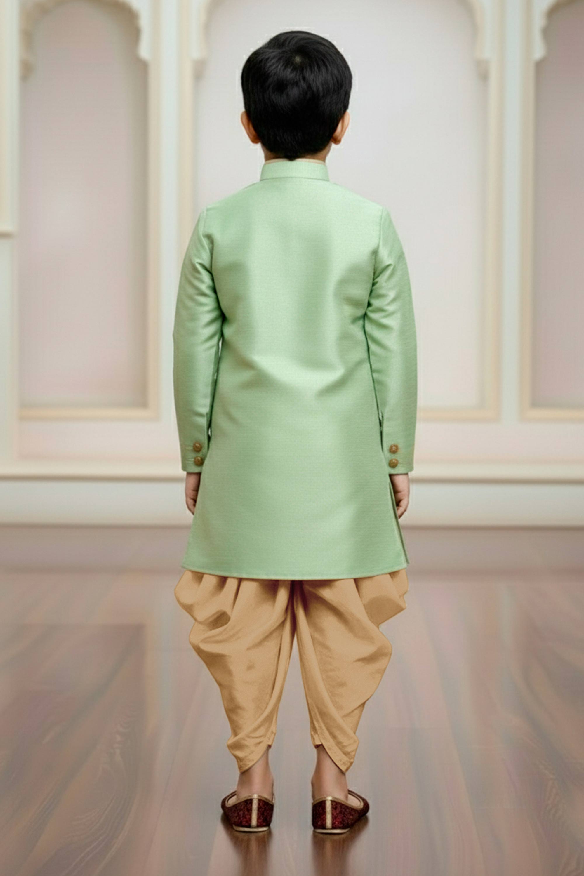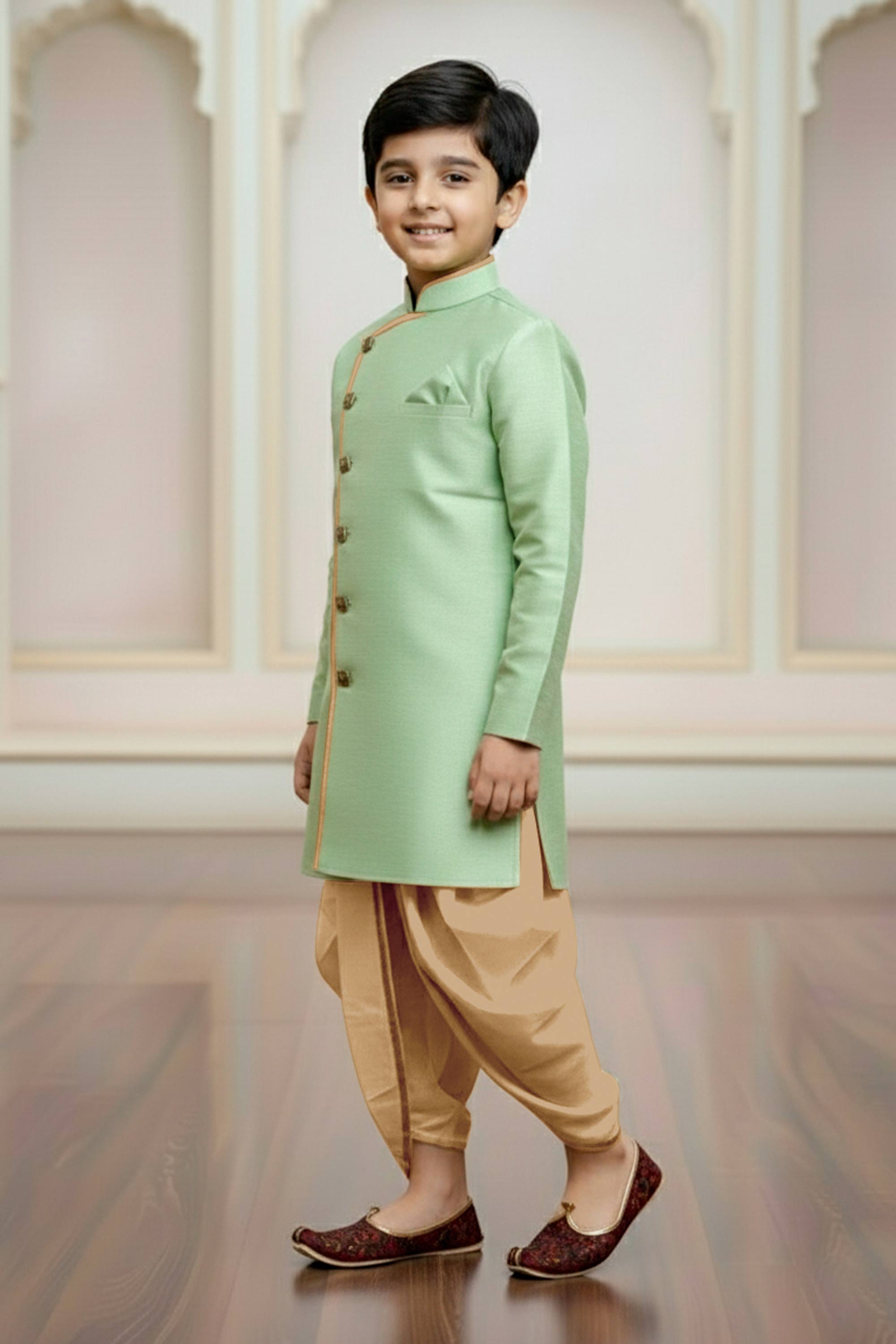 Sea Green Art Silk Wedding Wear Indo Western For Boys