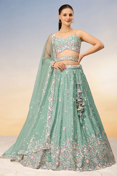 Sea Green Chiffon Sangeet Wear Lehenga With Sequins Work And Alluring Blouse