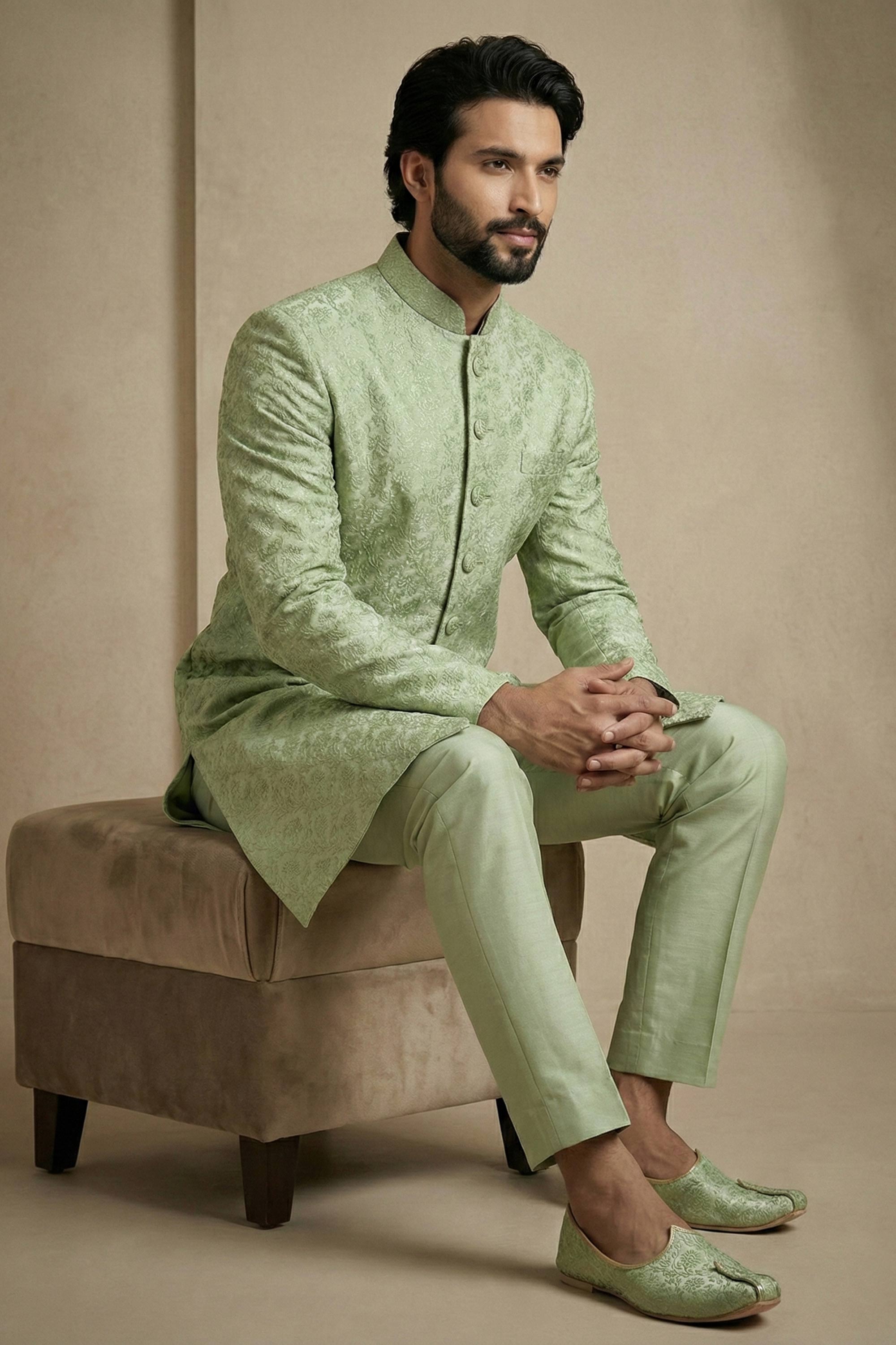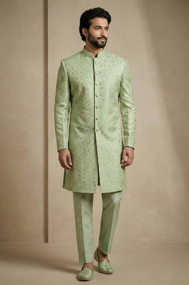 Sea Green Sangeet Wear Jacquard Fabric Readymade Indo Western For Men