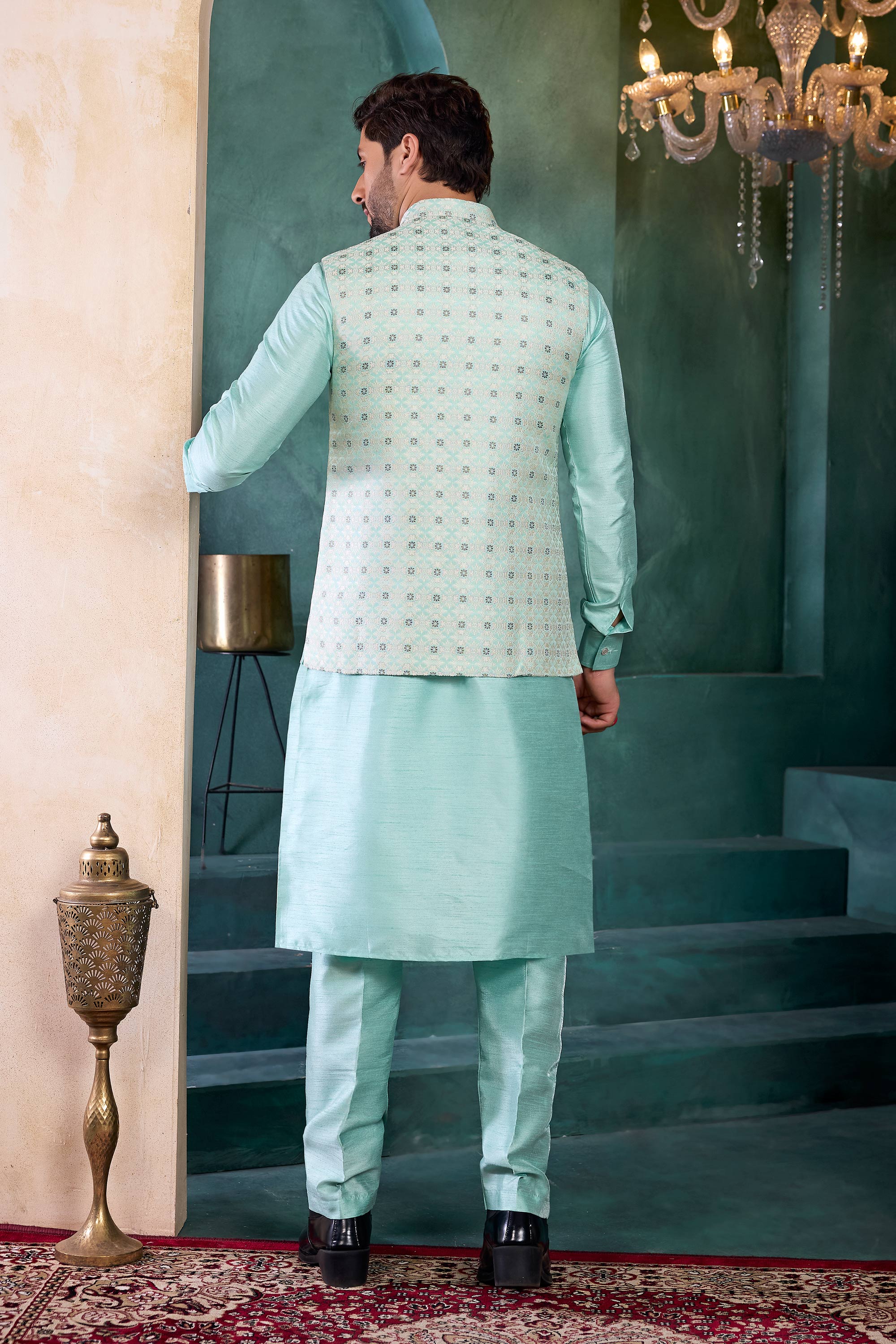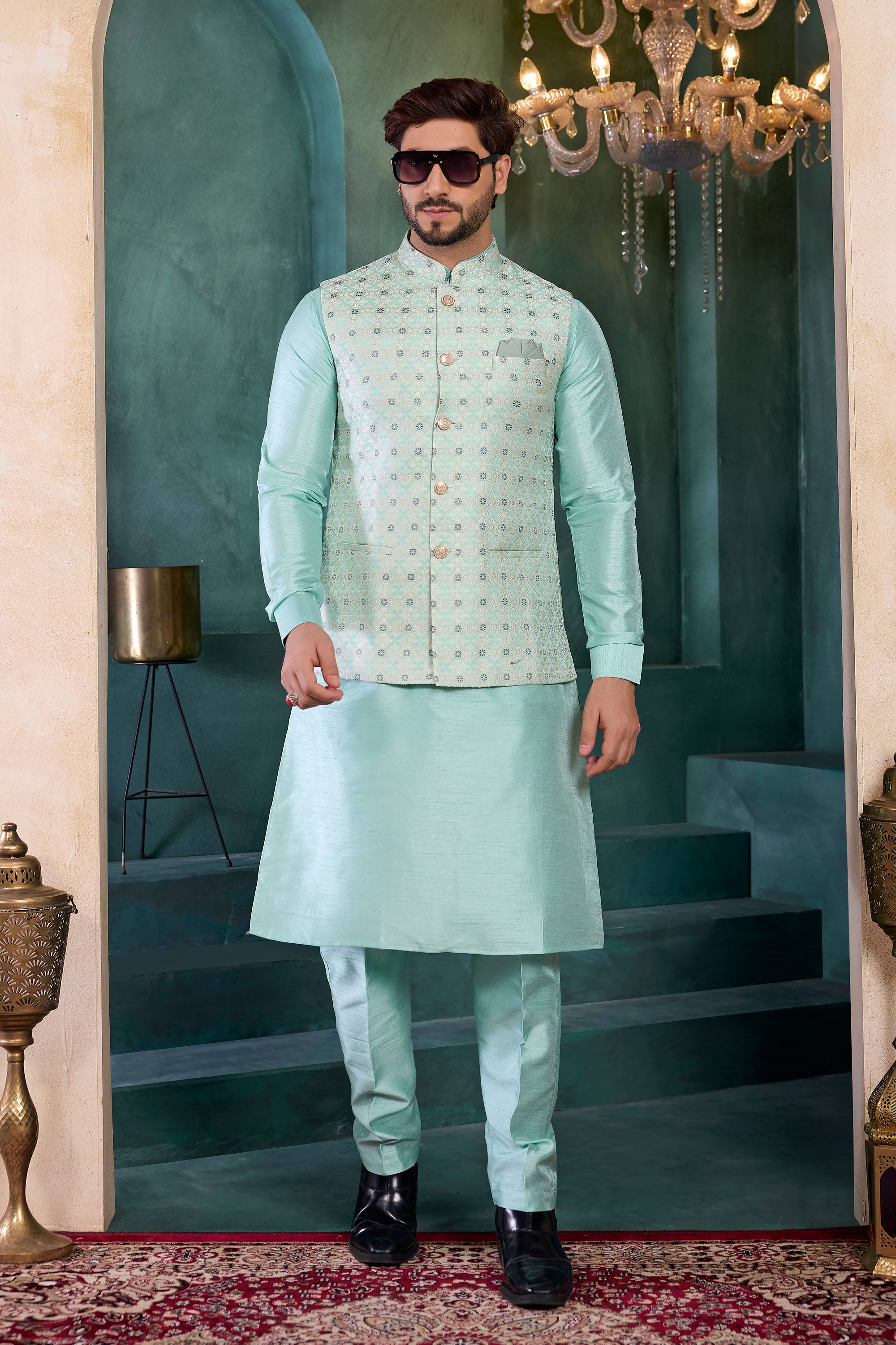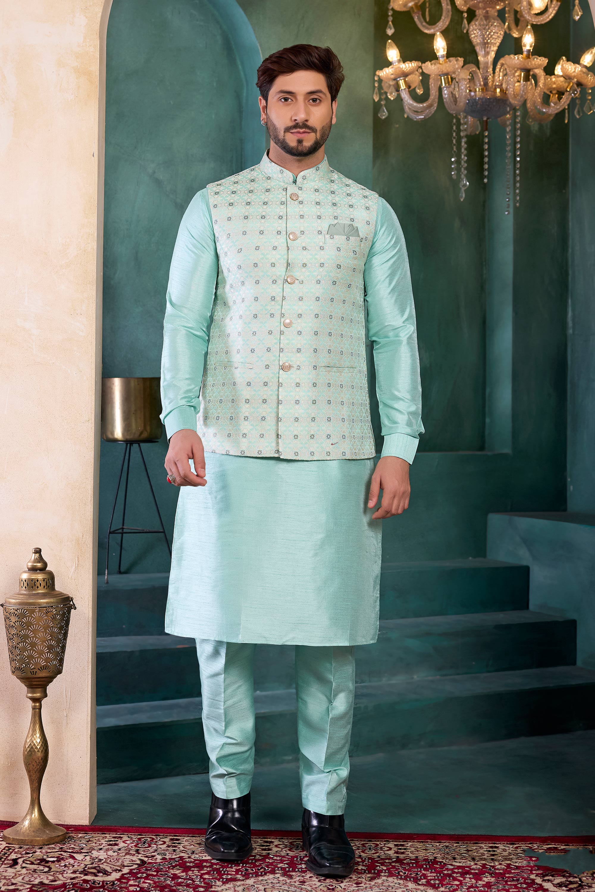 Sea Green Wedding Wear Readymade Kurta And Aligadhi Pant With Jacket For Men