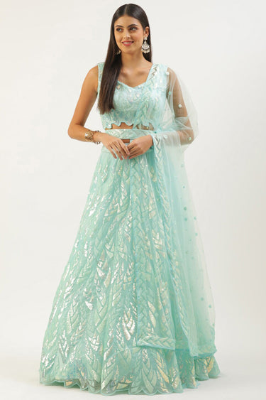 Sequins Work Net Fabric Cyan Color Sangeet Wear Lehenga Choli