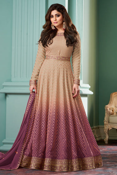 Shamita Shetty Beige Georgette Embroidered Party Wear Readymade Gown With Dupatta