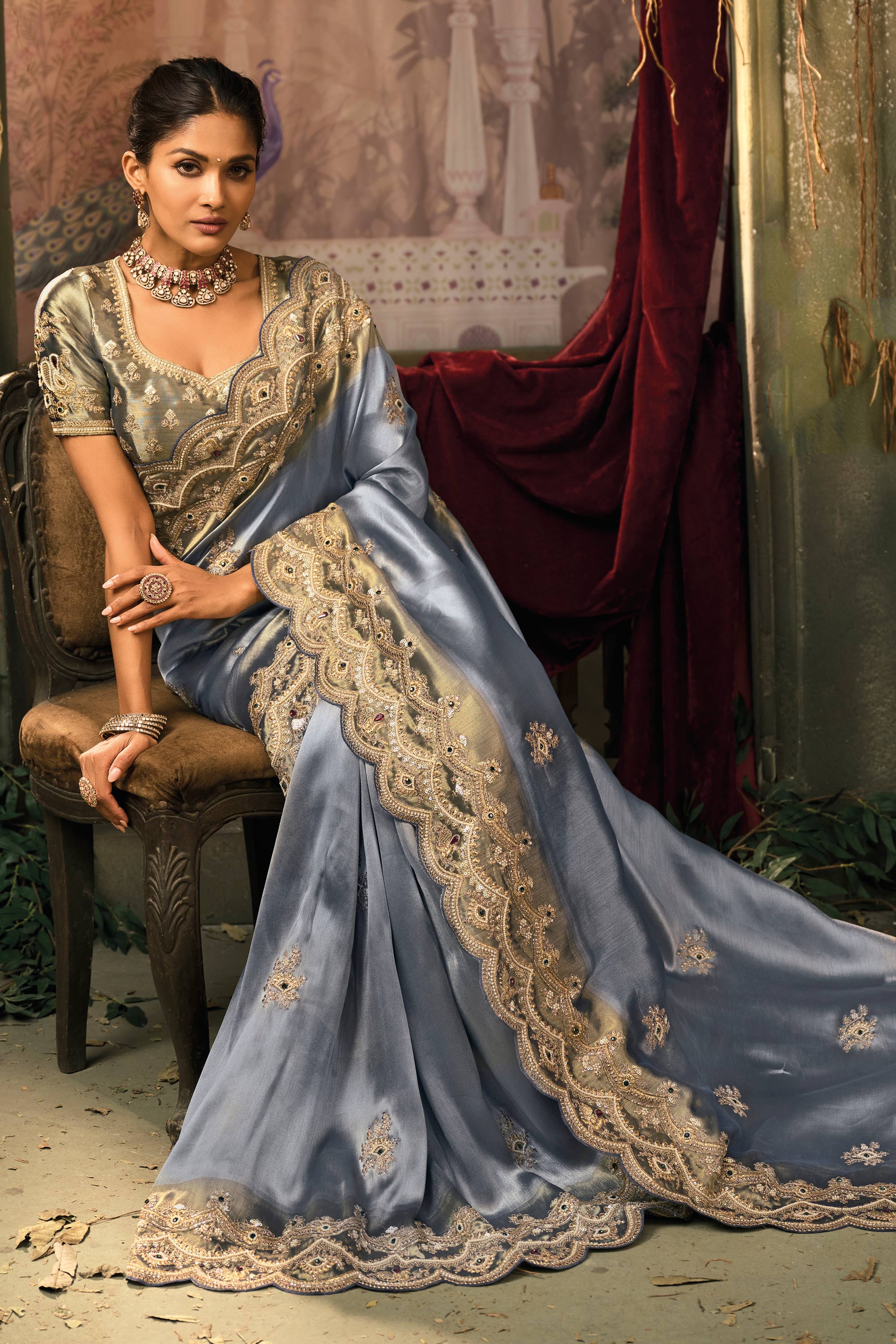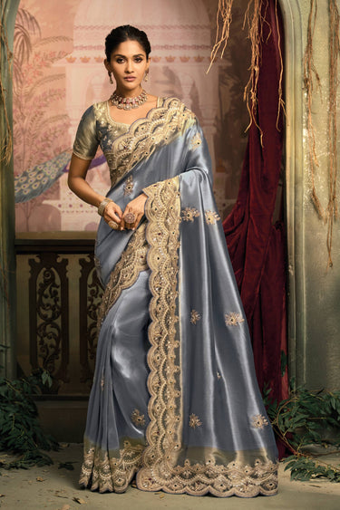 Silk Embroidered Cyan Wedding Wear Saree