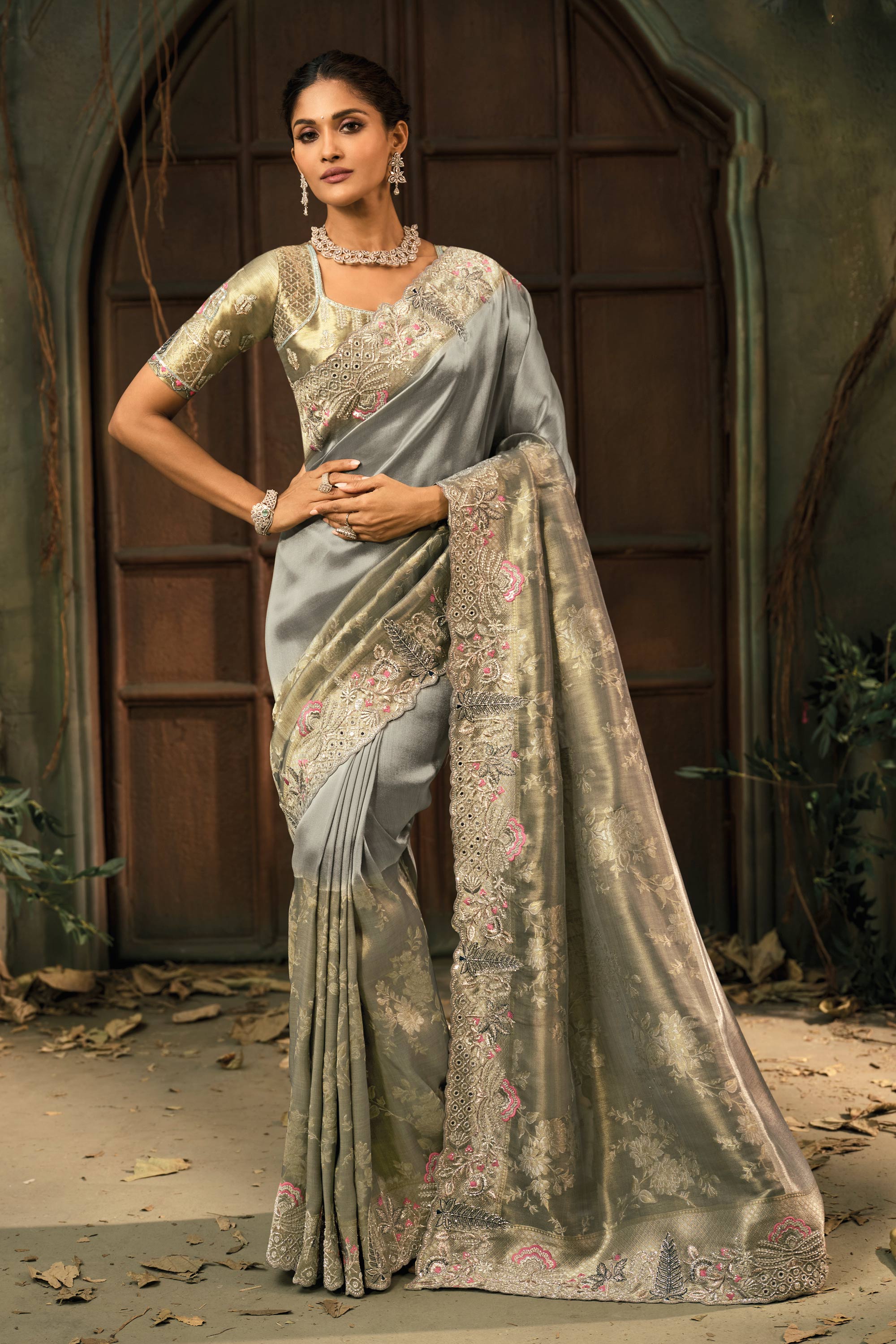 Silk Embroidered Grey Saree For Wedding Wear