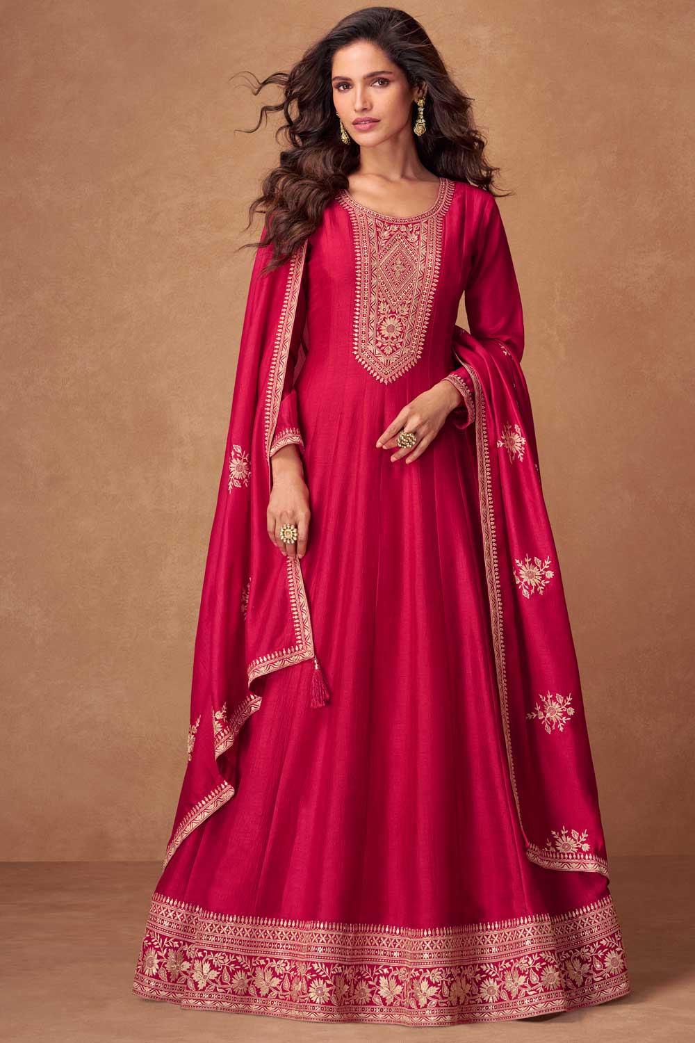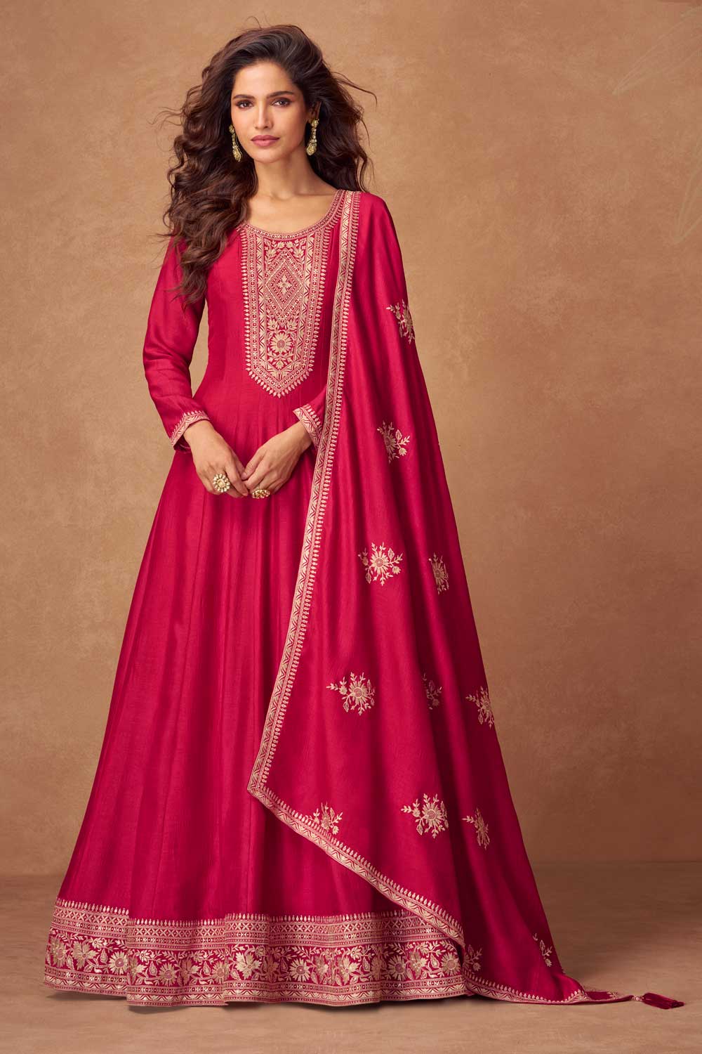 Silk Fabric Trendy Long Gown With Dupatta In Rani Color