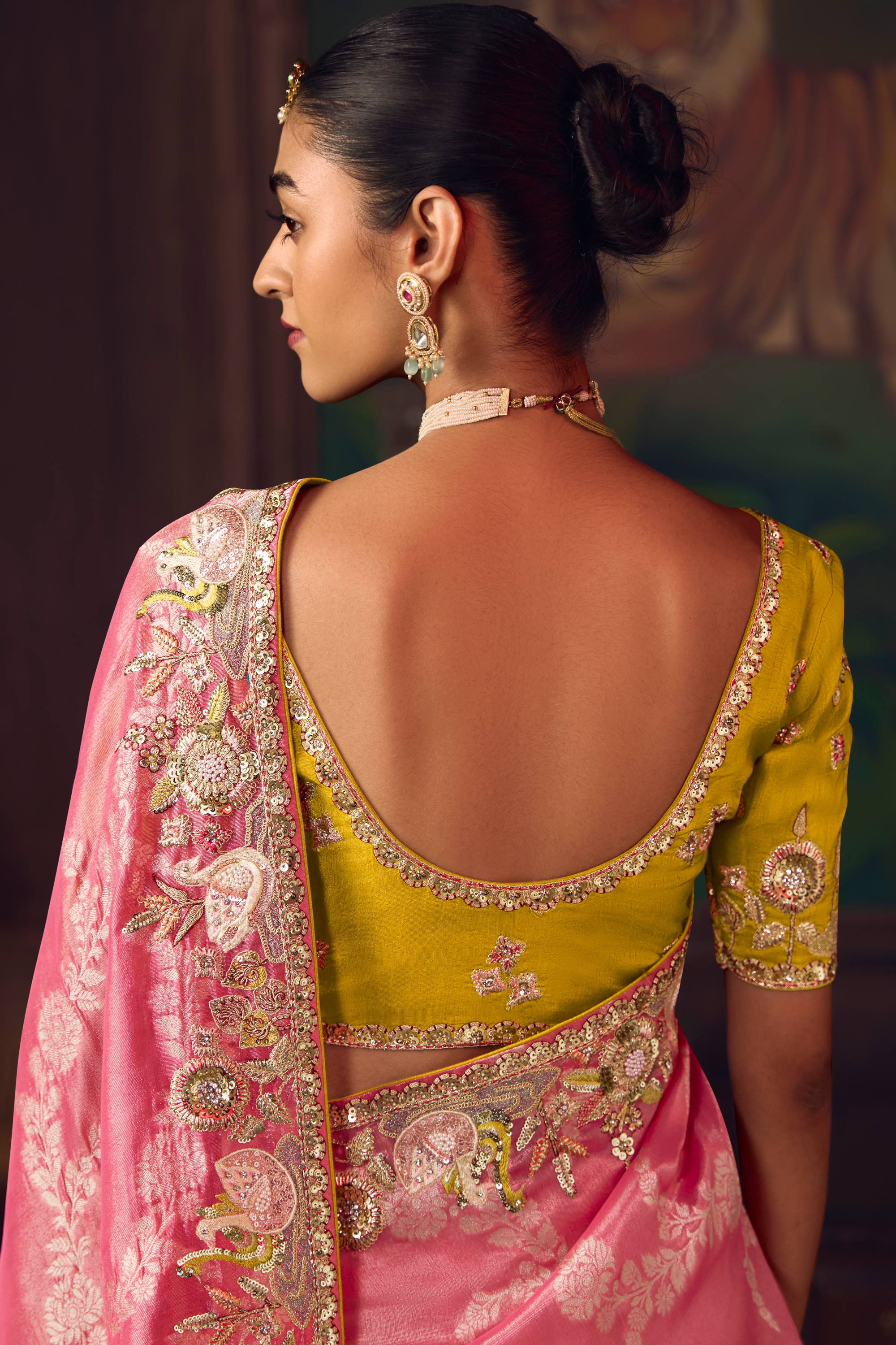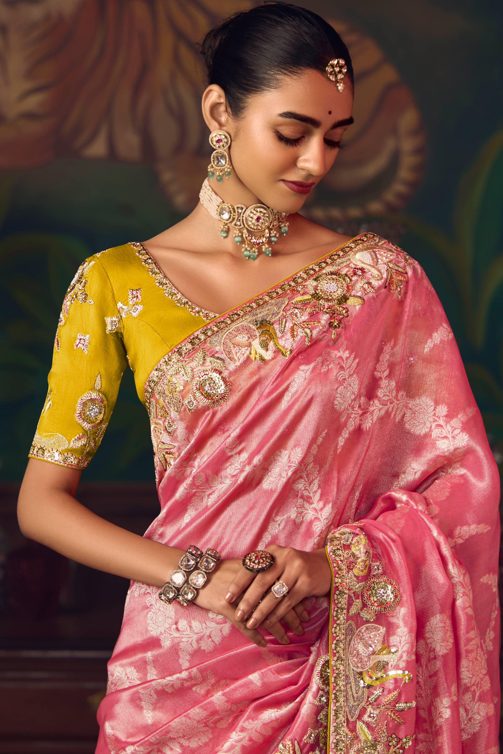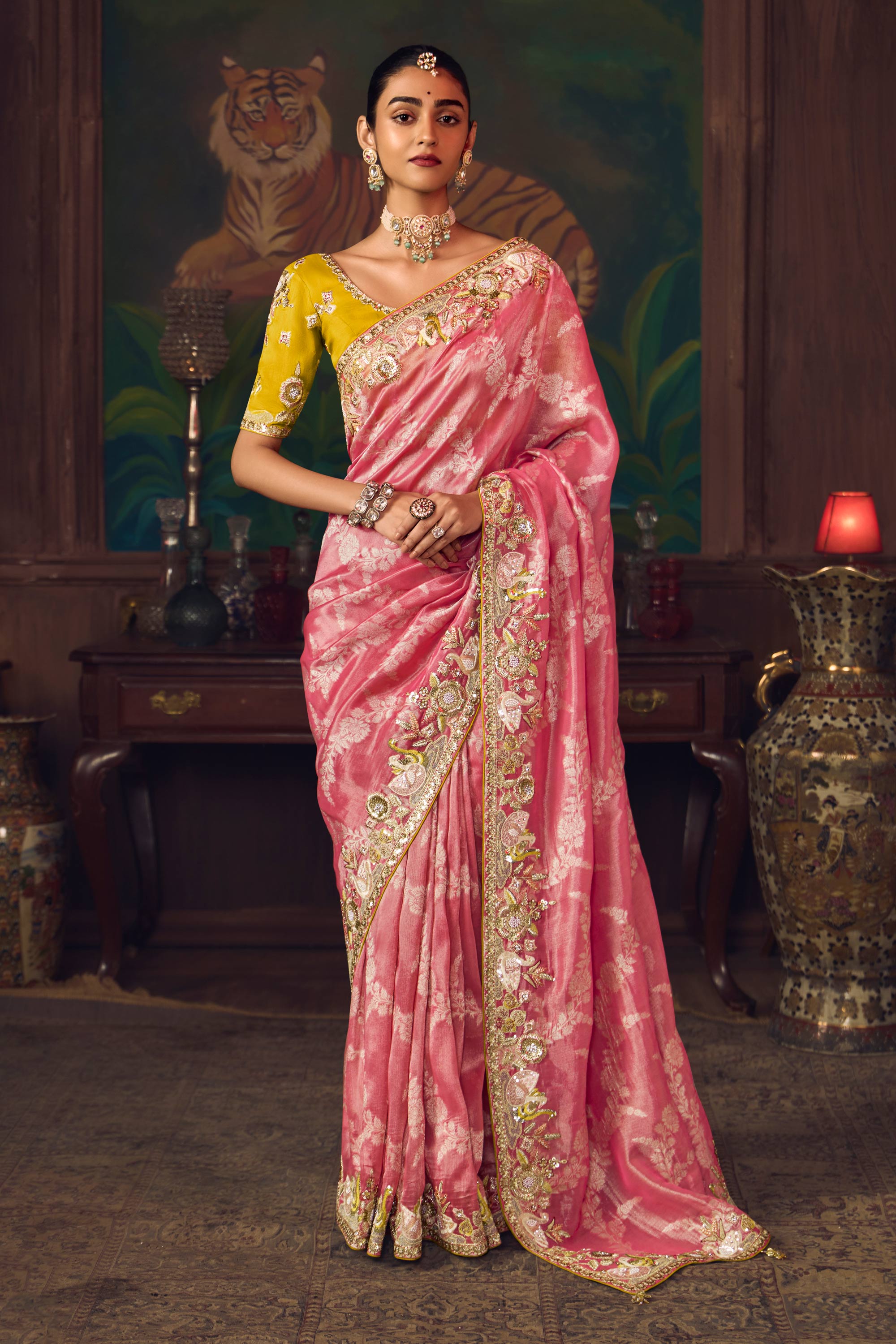 Silk Faric Pink Border Work Sangeet Wear Saree