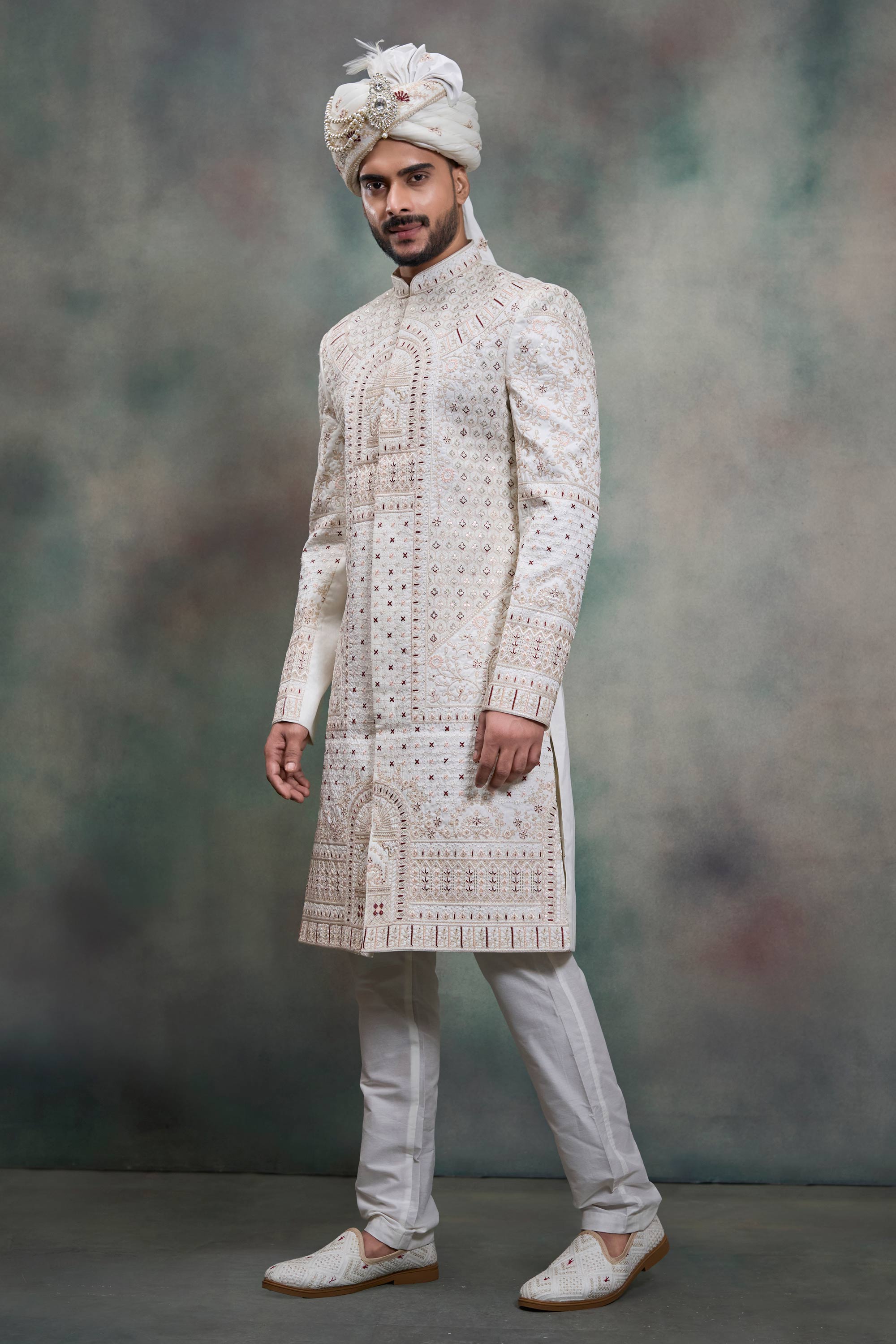 Silk Off White Embroidered Men Readymade Groom Sherwani
