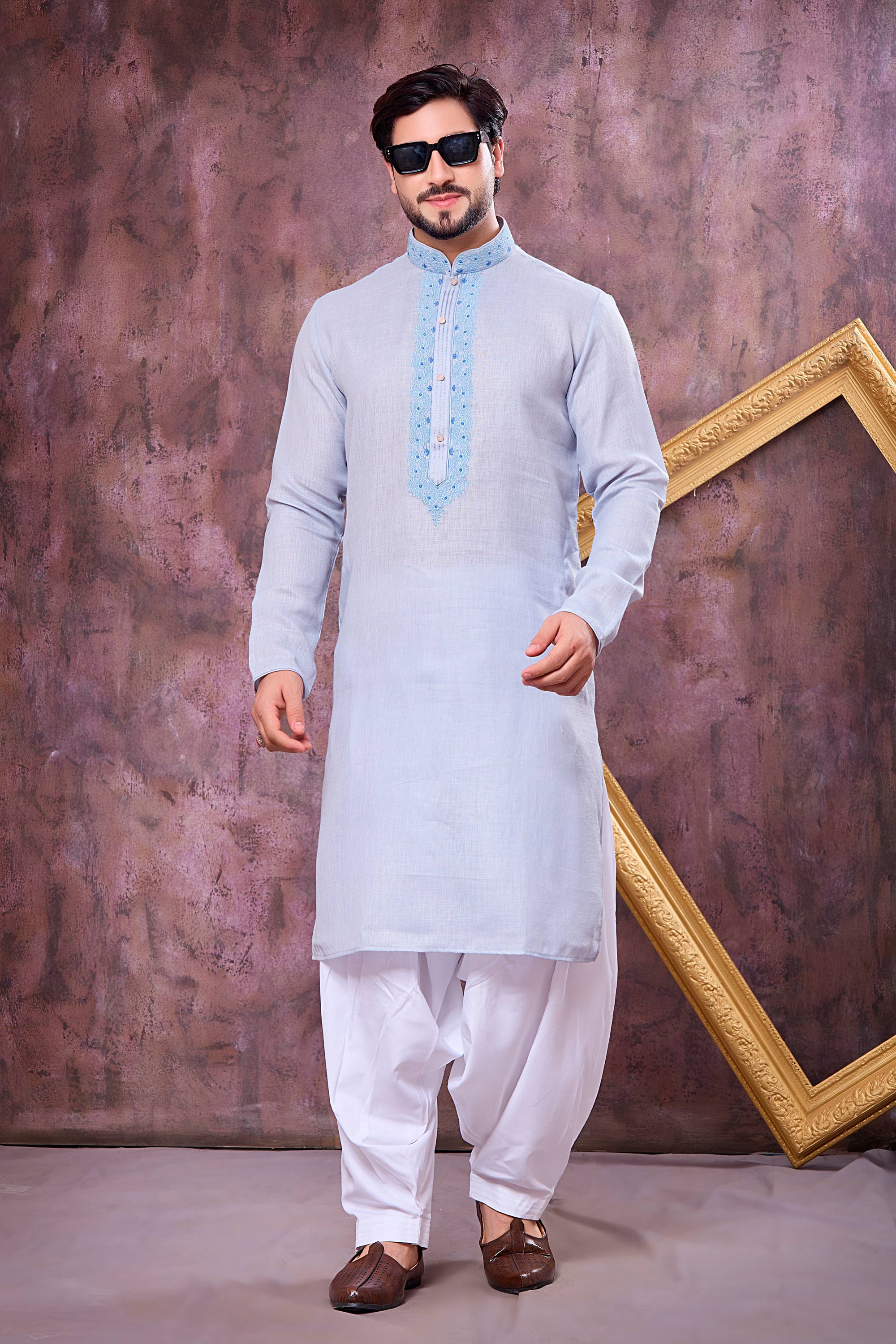 Add traditional elegance to your wardrobe with this Mens Readymade Kurta paired with a Patiala style bottom. The straight kurta is made from comfortable cotton fabric and highlighted with intricate embroidery work for a festive finish. The art silk Patiala bottom complements the look with its rich texture and stylish silhouette. Designed in a rich color, this outfit is perfect for sangeet and special occasions. Please note that slight color differences may occur due to digital photography.