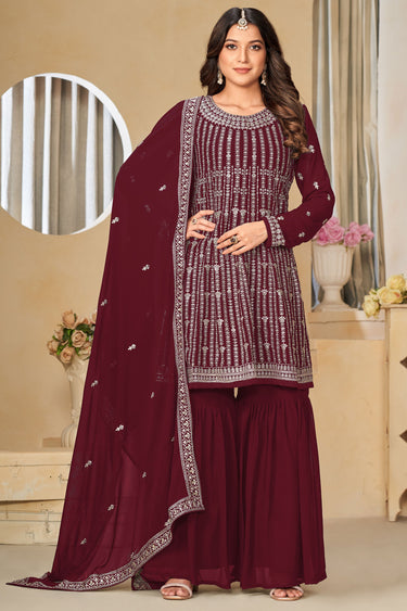 Sober Maroon Color Georgette Fabric Palazzo Suit With Embroidered Work