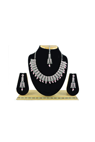Solid Alloy Material Necklace Set Earrings And Mang Tikka For Women In Pink Color