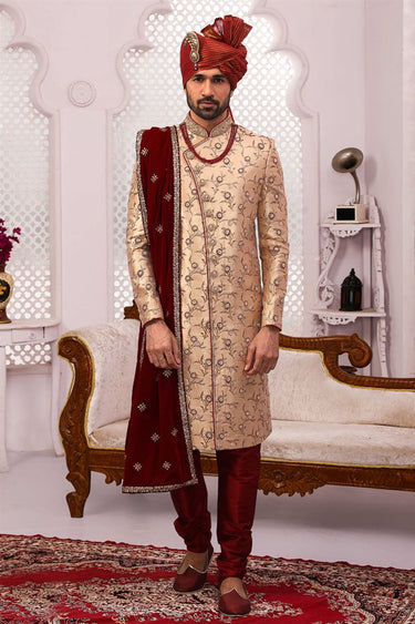 Striking Chikoo Color Jacquard Silk Fabric Heavy Embroidered Designer Groom Sherwani