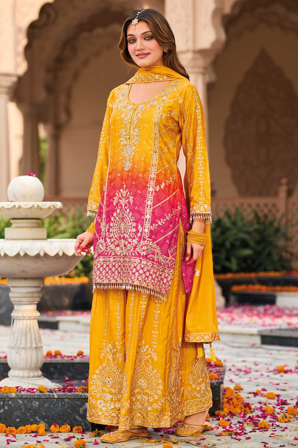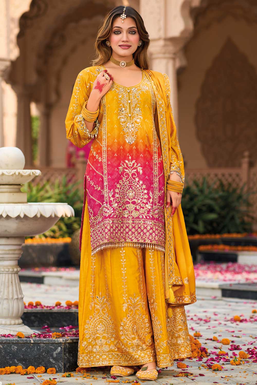 Stylish Mustard Color Chinon Fabric Readymade Palazzo Suit