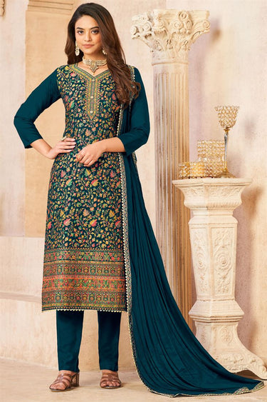 Teal Color Jacquard Work Pure Dola Pant Style Suit
