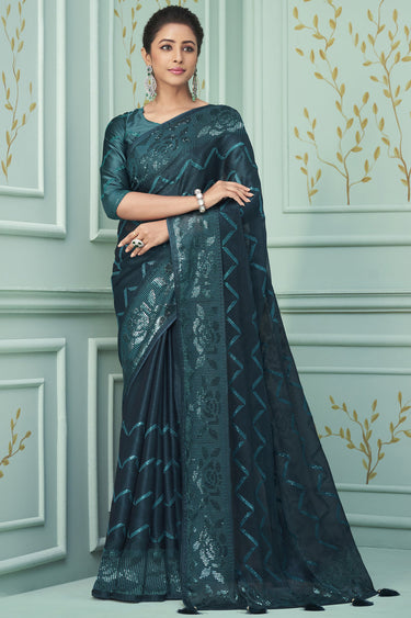 Teal Color Reception Wear Sequins Work Chiffon Fabric Saree