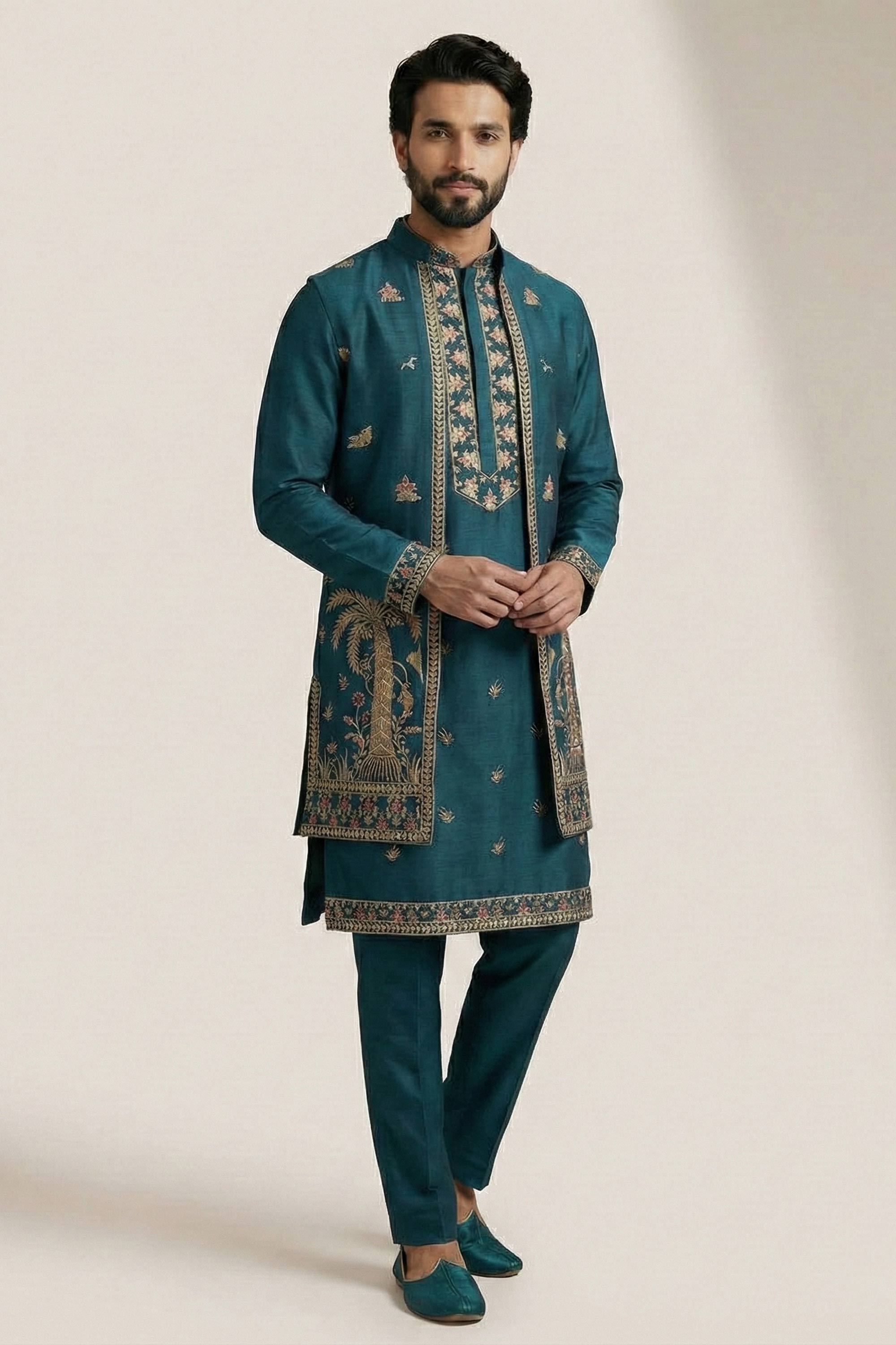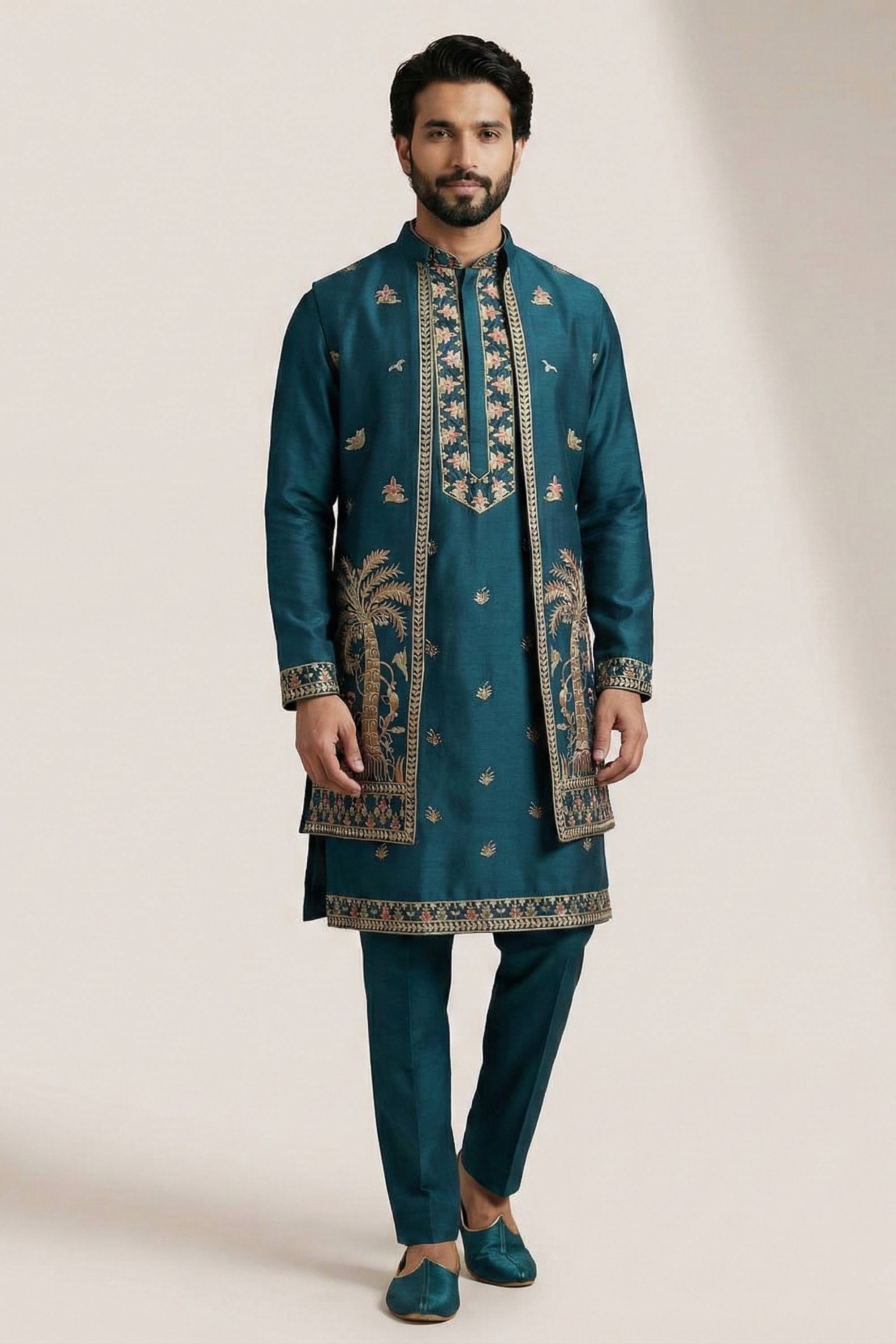Teal Festive Wear Satin Embroidered Readymade Kurta Pyjama With Jacket For Men