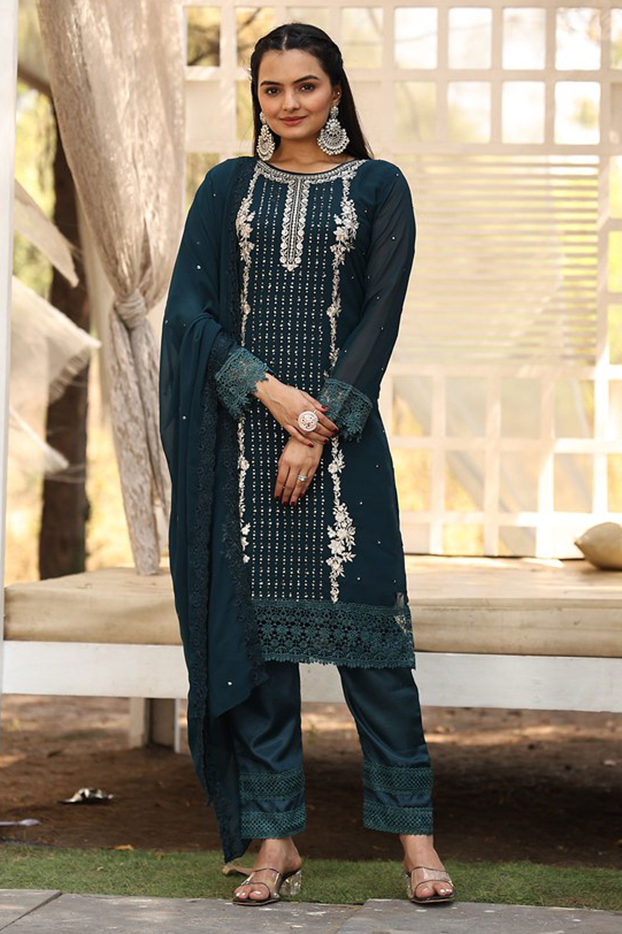 Teal Georgette Embroidered Readymade Straight Cut Salwar Kameez