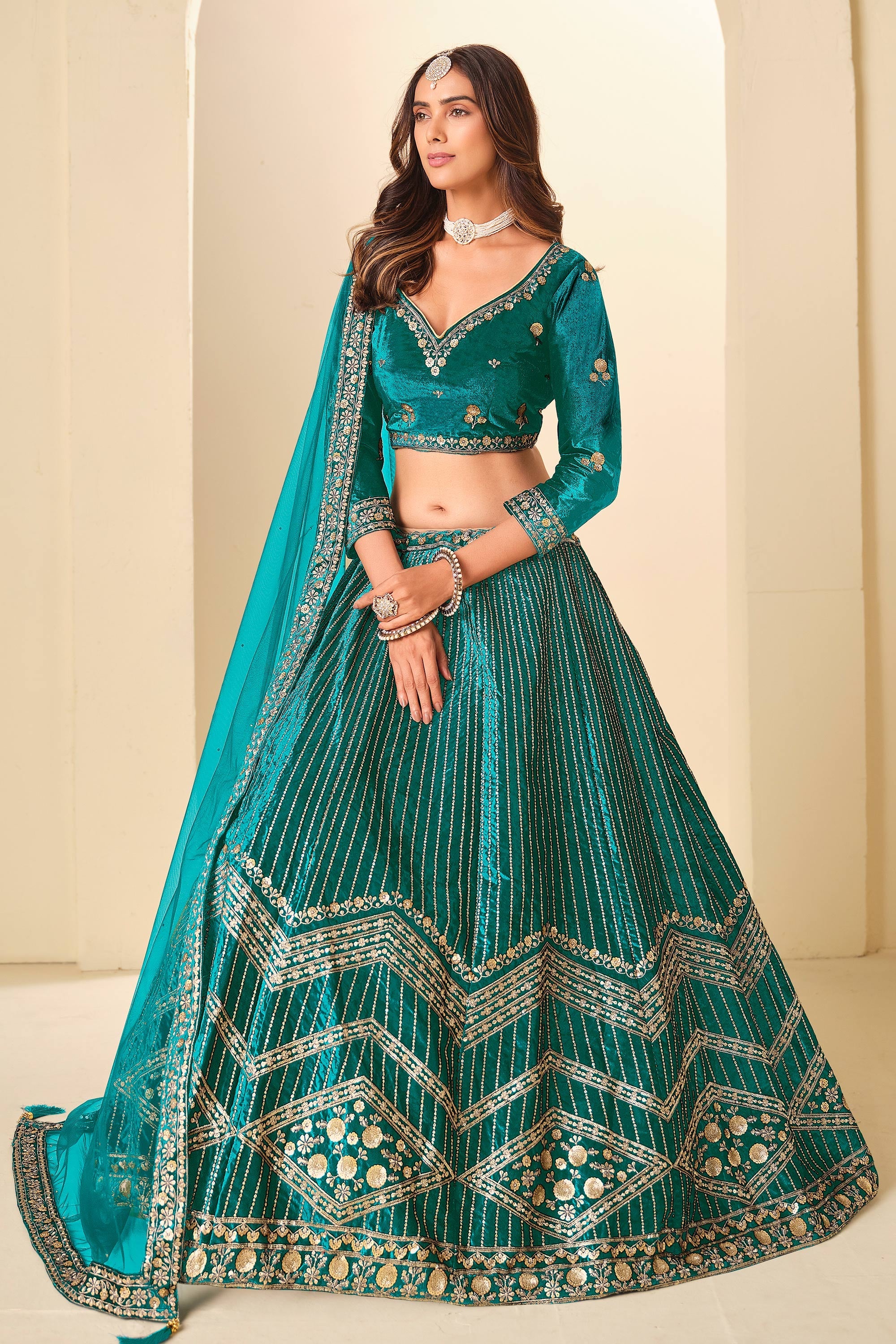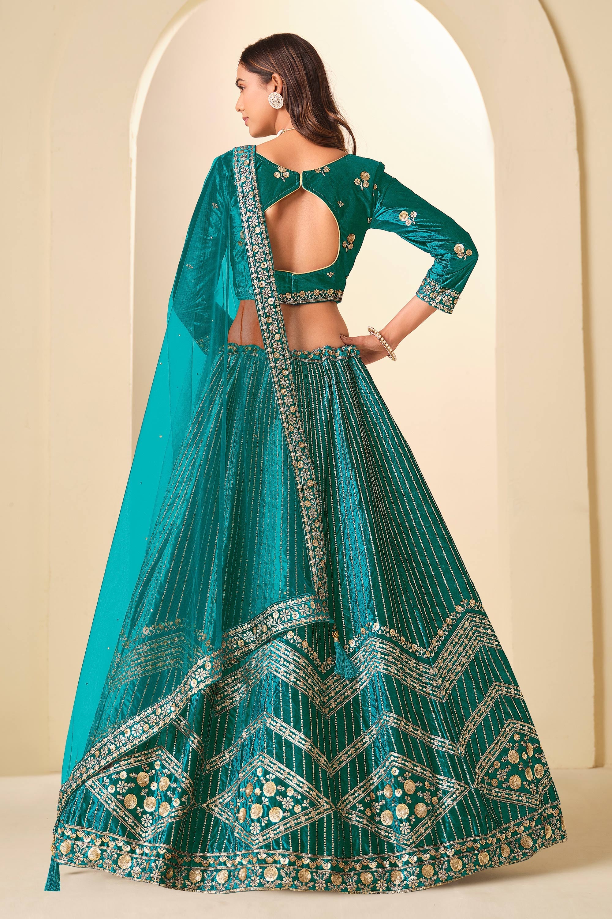 Teal Wedding Wear Velvet Embroidered Lehenga Choli With Dupatta