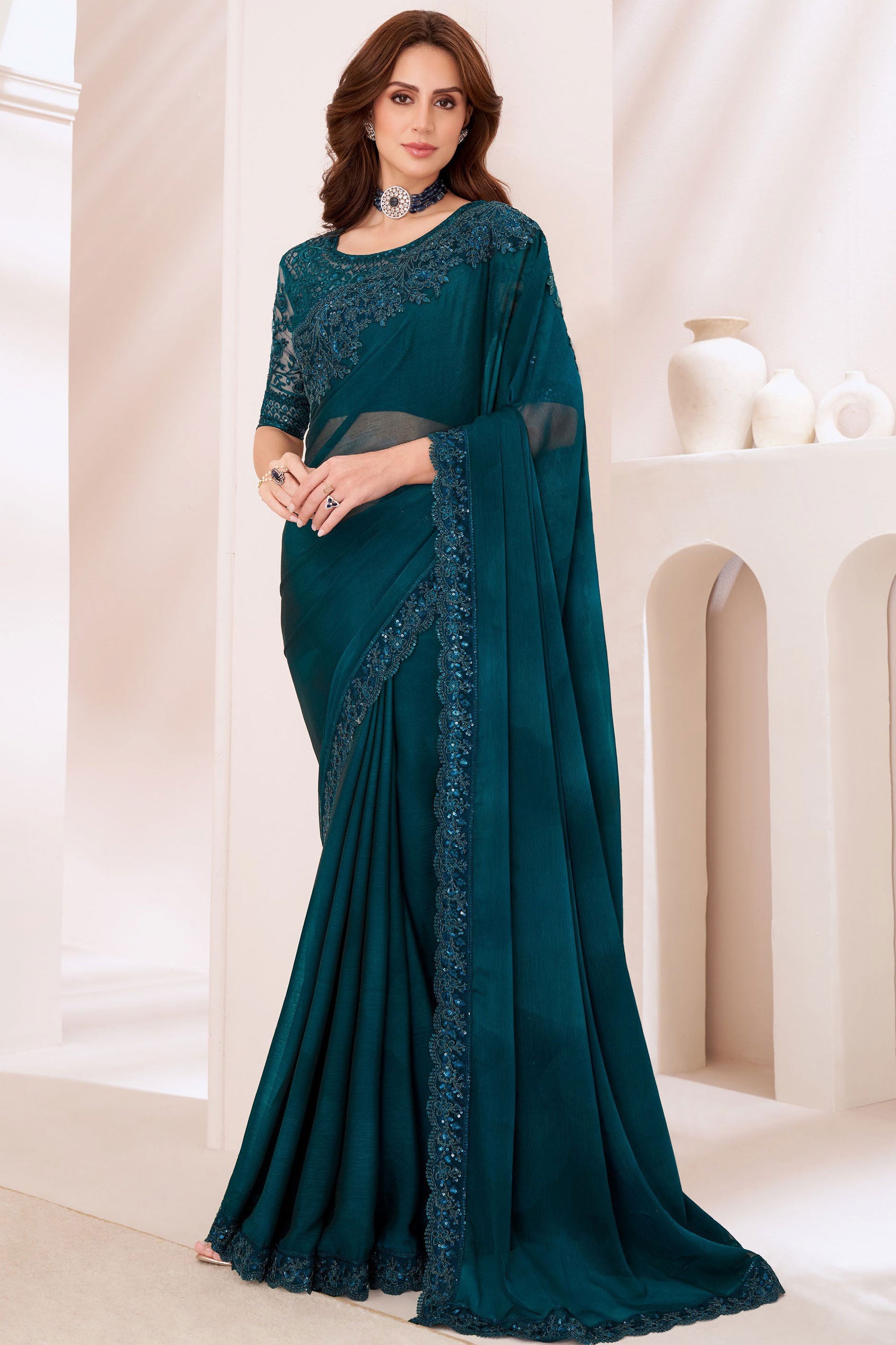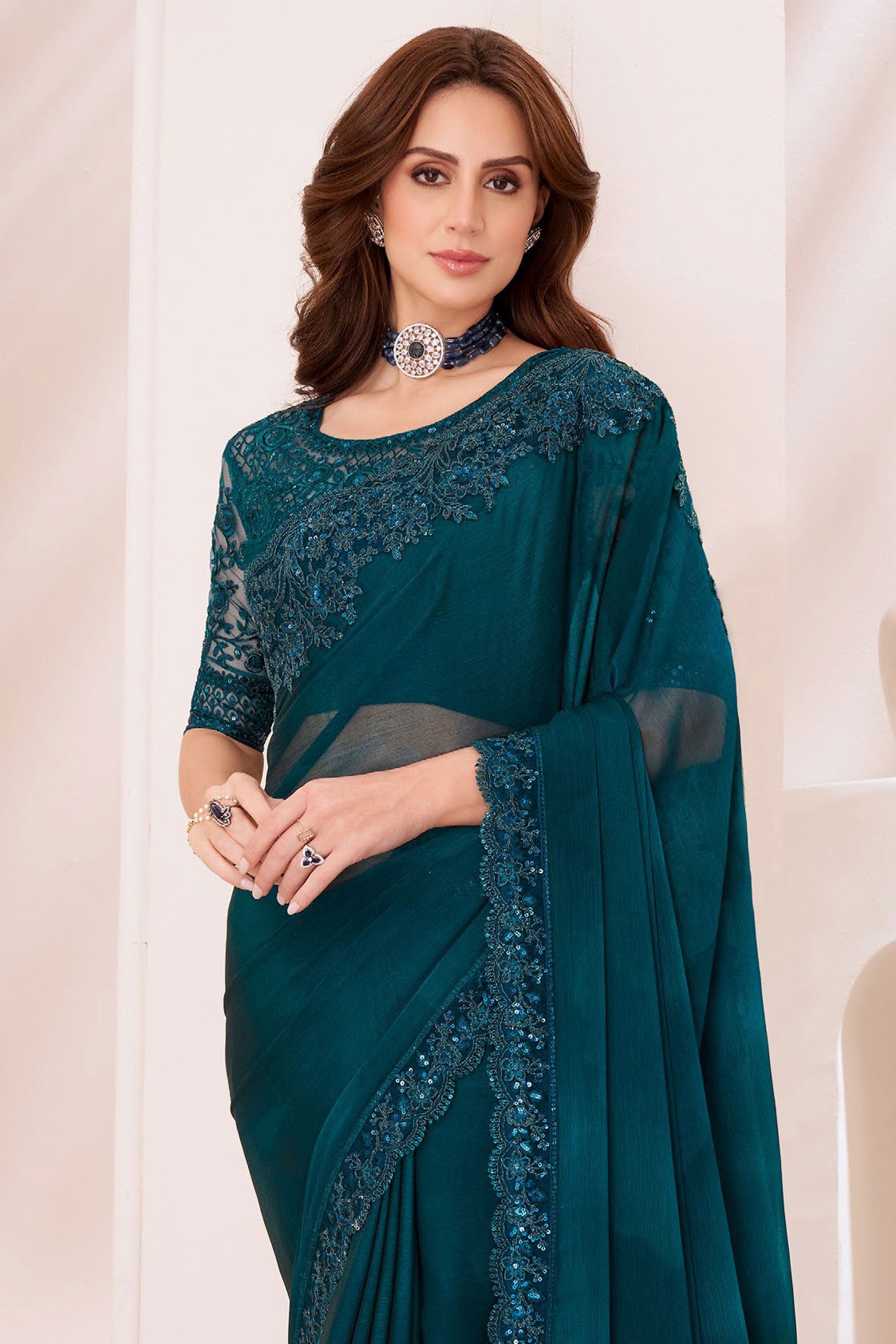 Tempting Chiffon Fabric Teal Color Saree With Border Work