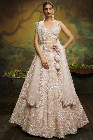 Tempting Net Fabric Cream Color Wedding Wear Lehenga Choli With Embroidered Work