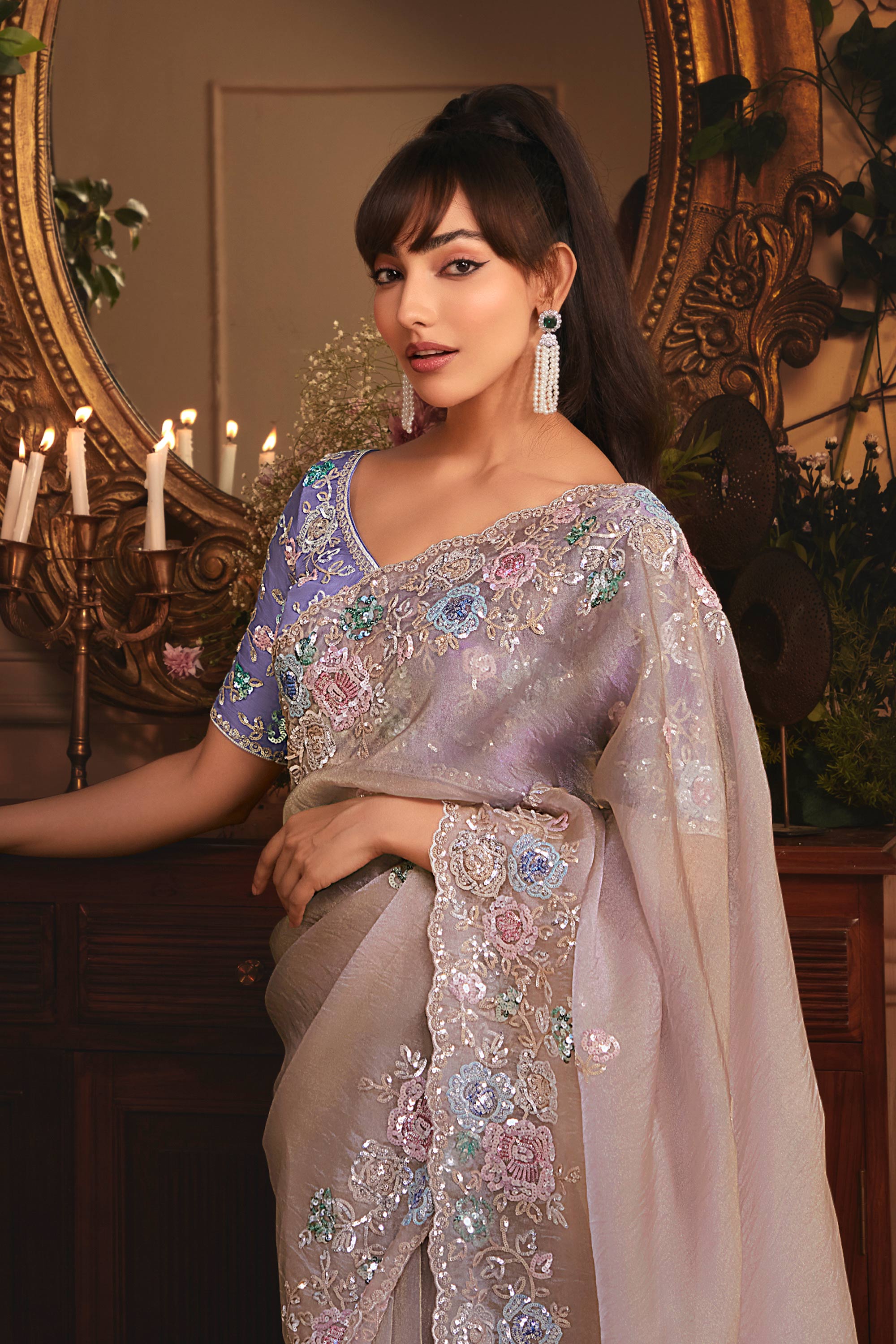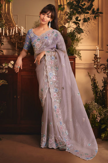 Add a touch of ethereal charm to your festive wardrobe with this elegant Designer Tissue Organza Saree. The sheer, lightweight tissue organza fabric lends a graceful flow and a soft shimmer, perfect for festive and function wear. Paired with a rich silk blouse, it creates a luxurious contrast that elevates the entire look. Intricately crafted border work enhances the saree’s refined appeal, making it an ideal choice for weddings, festivals, and special celebrations. Effortlessly stylish and delicately detailed, this saree is a timeless statement of sophistication. Note: Due to digital photography, slight color variations may occur