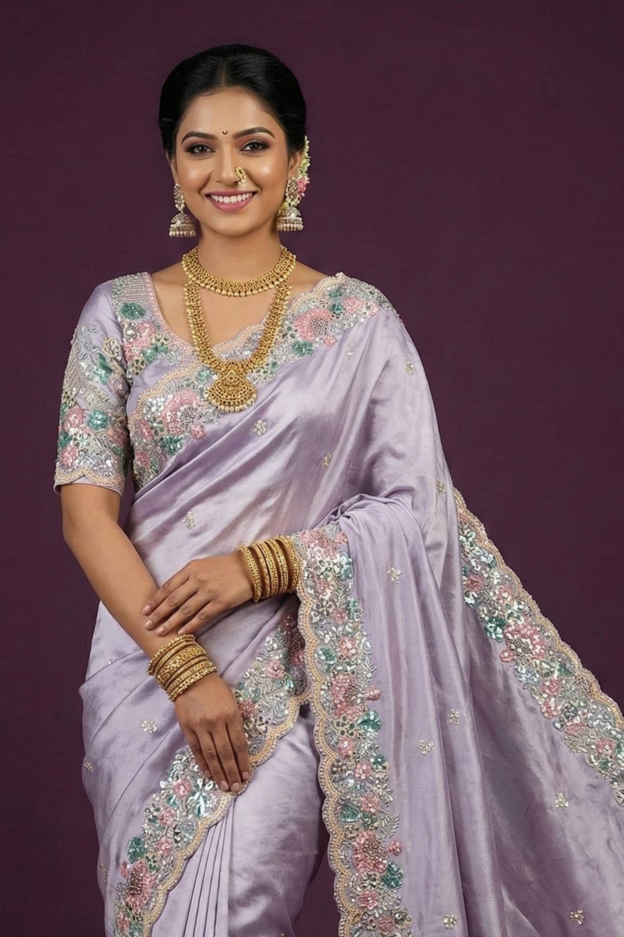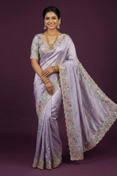Tissue Silk Embroidered Lavender Festive Wear Saree