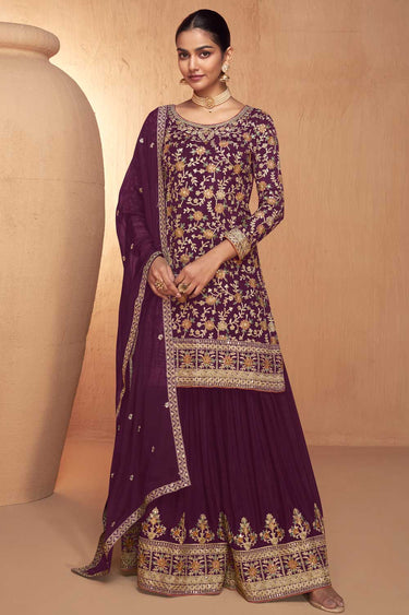Elevate Your Elegance with This Readymade Palazzo Sharara Suit Step into the spotlight with this stunning Palazzo Sharara Suit crafted from premium Real Chinon fabric for the top, bottom, and dupatta. Designed with intricate embroidery work, this ensemble exudes grace and sophistication, making it the perfect choice for any function or festive occasion. The flowing silhouette of the palazzo adds a contemporary touch to the traditional sharara style, ensuring comfort without compromising on glamour. The matching dupatta, delicately designed, completes the look with effortless charm. Note: Slight color variations may occur due to digital photography. Turn heads and leave a lasting impression in this timeless piece. Perfect for the modern woman who loves to blend tradition with trend.