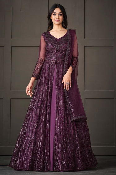Trendy Purple Color Net Fabric Anarkali Suit With Sequins Work