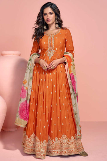Vartika Singh Chinon Silk Fabric Luminous Readymade Gown With Dupatta In Orange Color