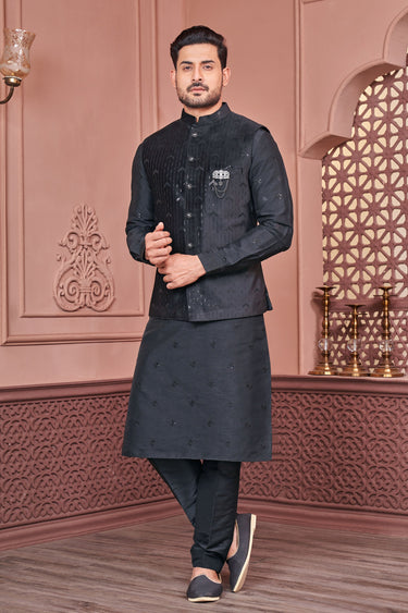 Velvet Black Festive Wear Readymade Lovely Embroidery Work Kurta Pyjama For Men With Jacket