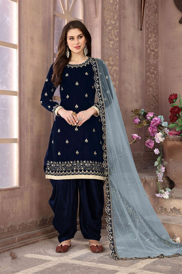 Velvet Fabric Navy Blue Function Wear Embroidered Patiala Suit