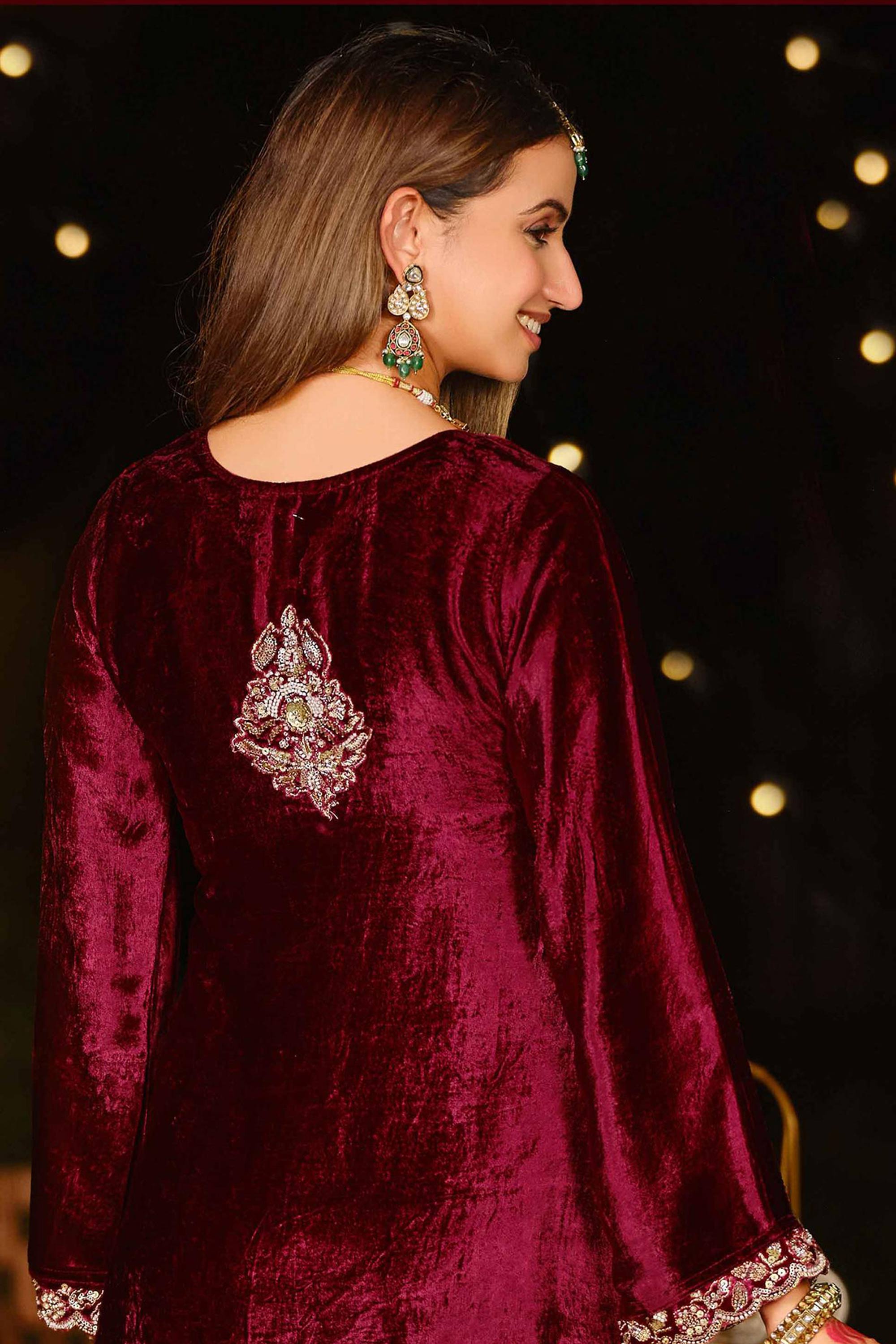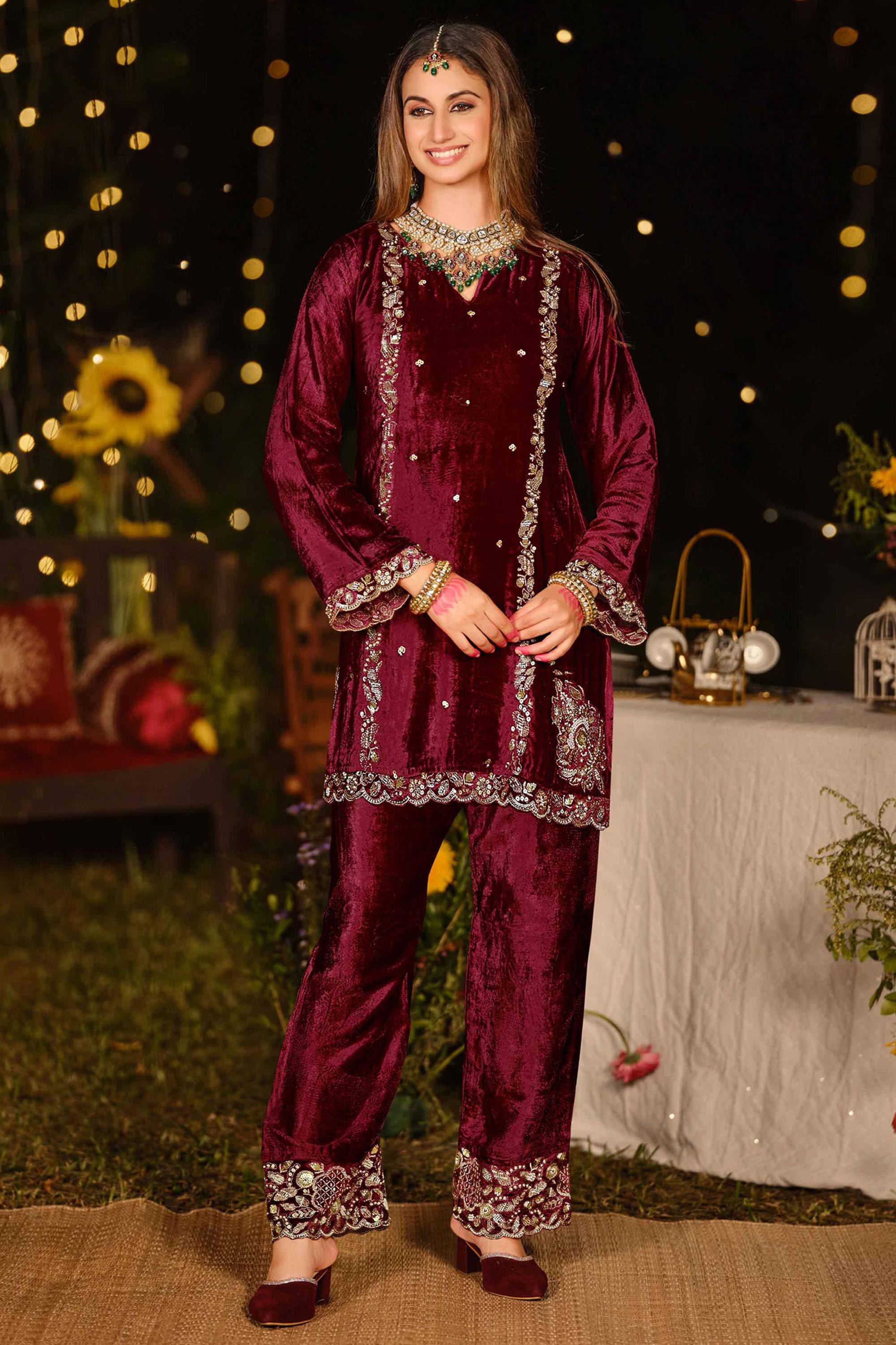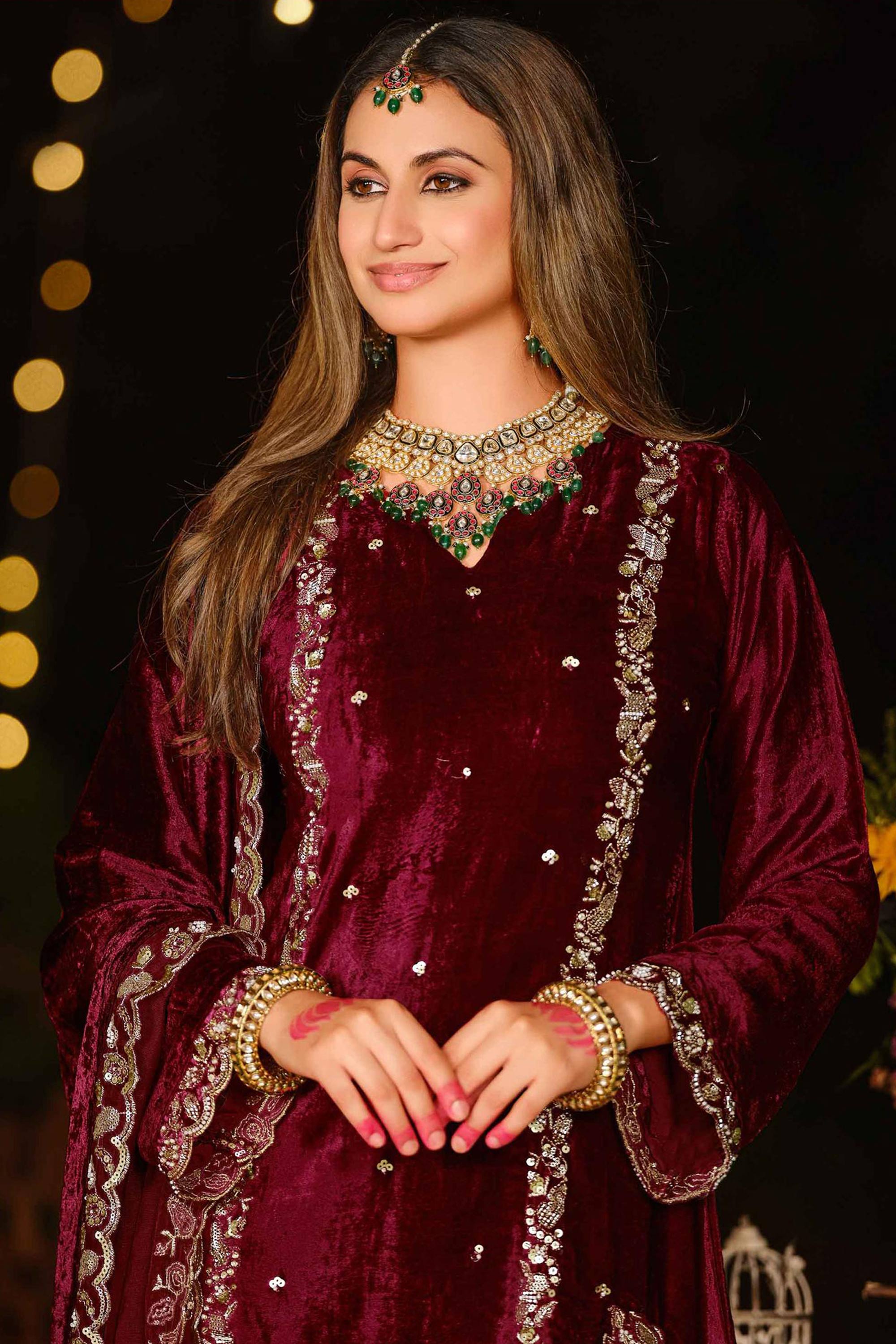 Velvet Function Wear Embroidered Designer Dress In Maroon Color