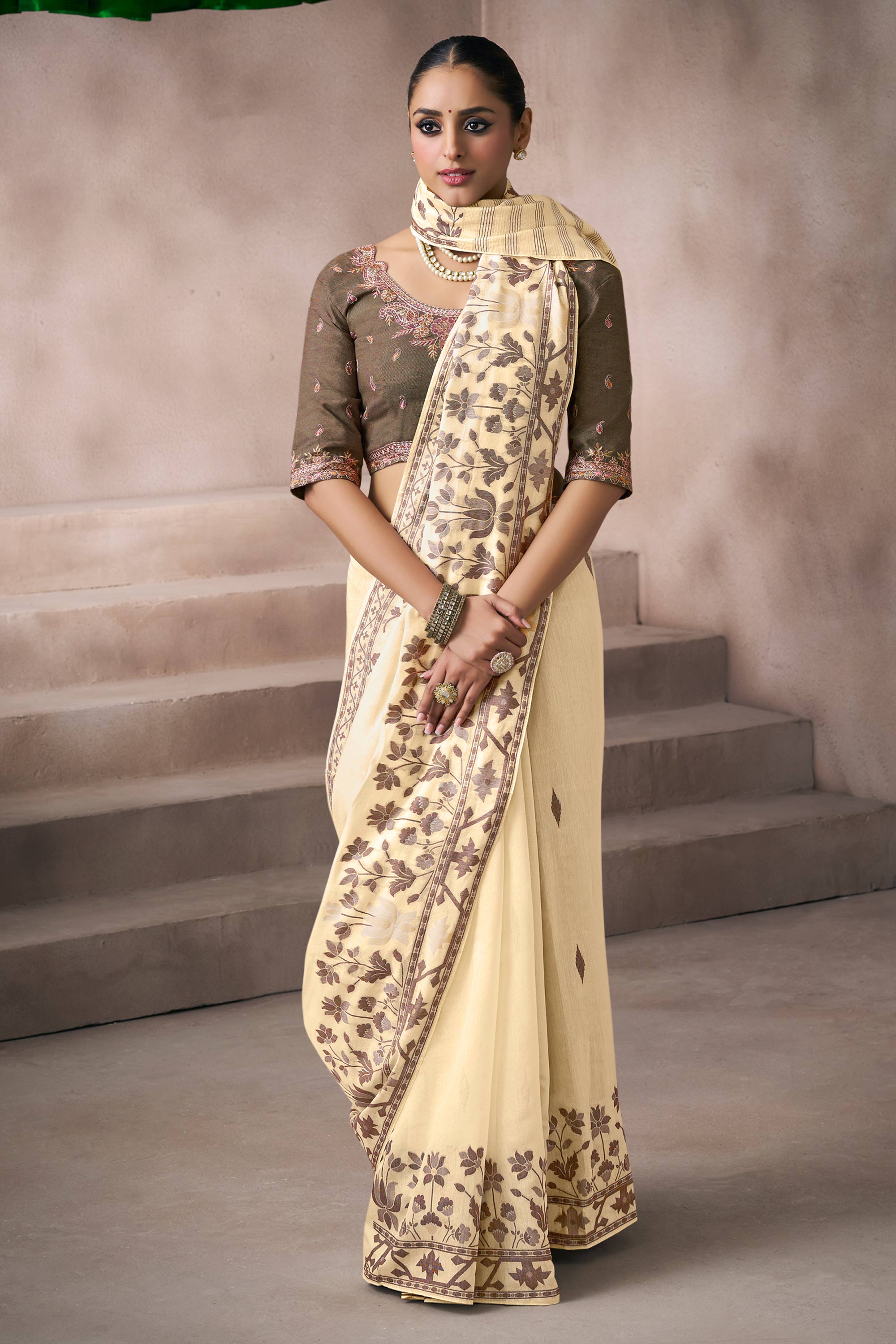 Viscose Cotton Embroidered Work Saree In Beige Color
