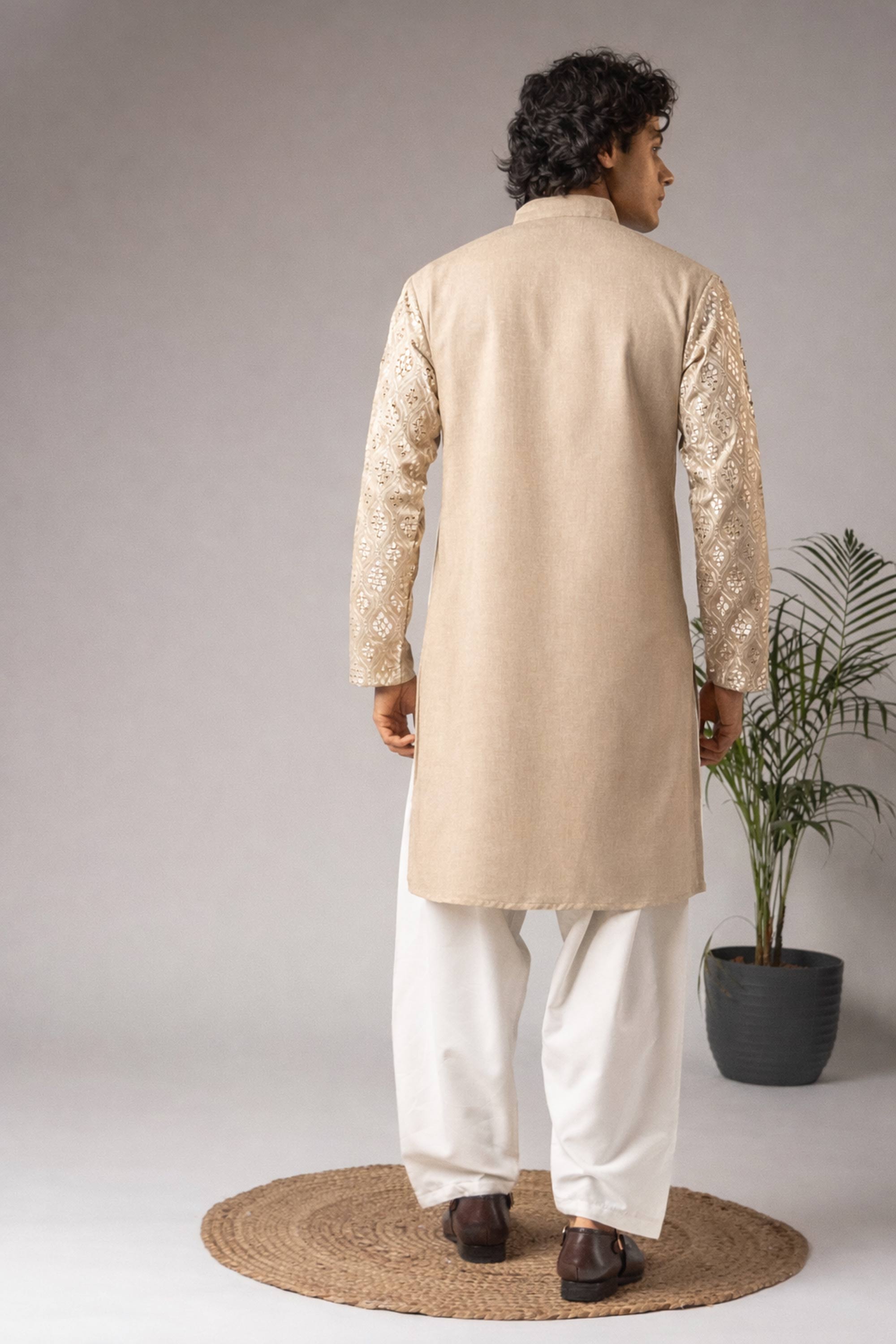 Designed to suit various festive and formal functions, this mens kurta pajama combines style, comfort, and tradition. The embroidered kurta creates a sophisticated look, while the cotton pajama ensures all-day comfort. This readymade ethnic outfit is an excellent addition to any traditional wardrobe. Note: Due to digital photography, slight color variations may occur.