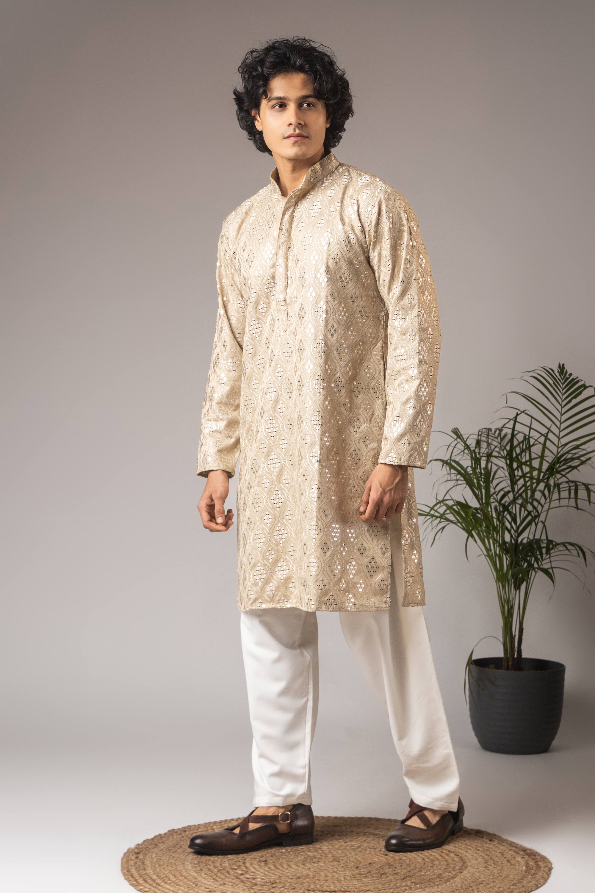 Viscose Embroidered Beige Men Readymade Kurta Pyjama For Function Wear