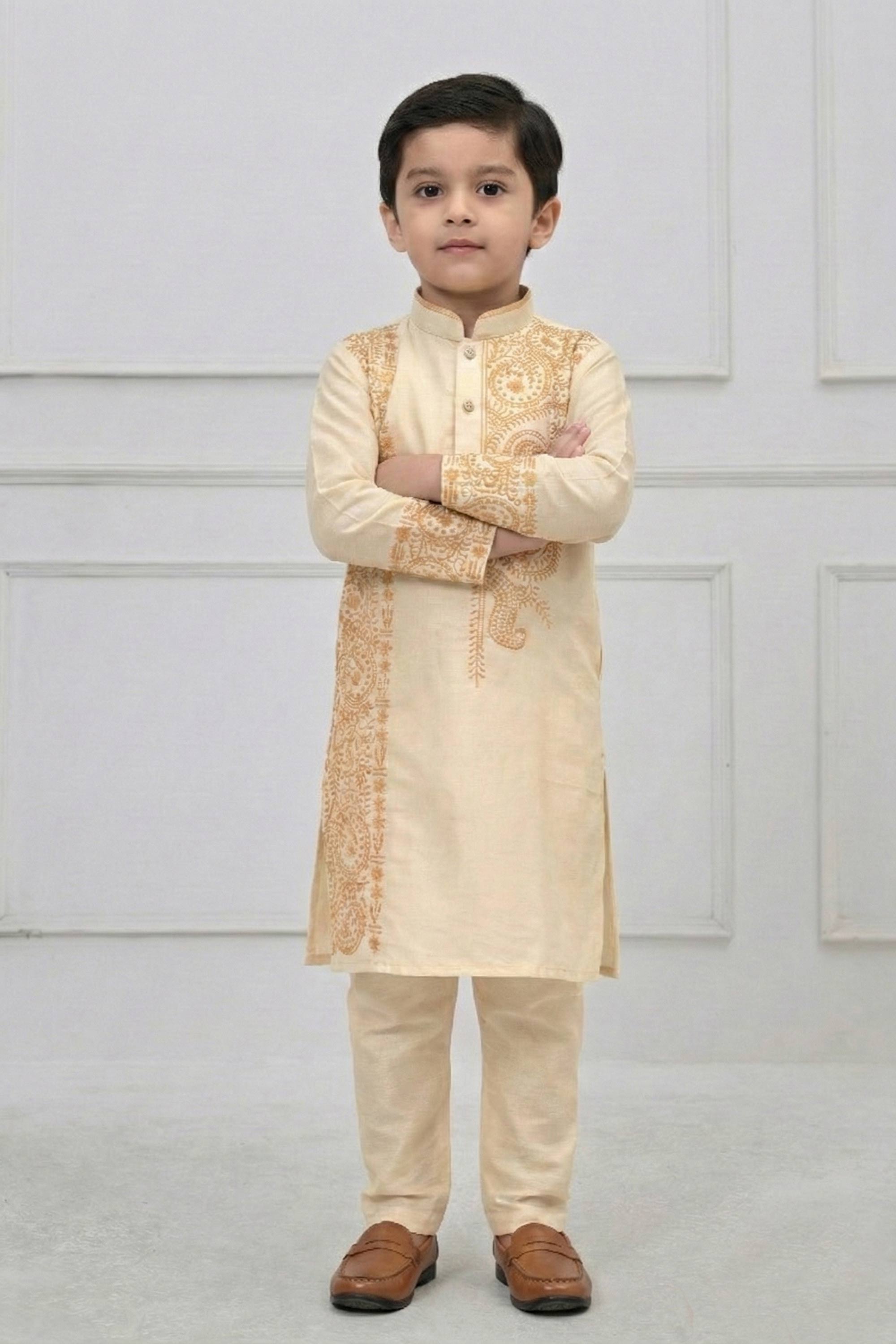 Viscose Embroidered Beige Sangeet Wear Readymade Kurta Pyjama For Boys