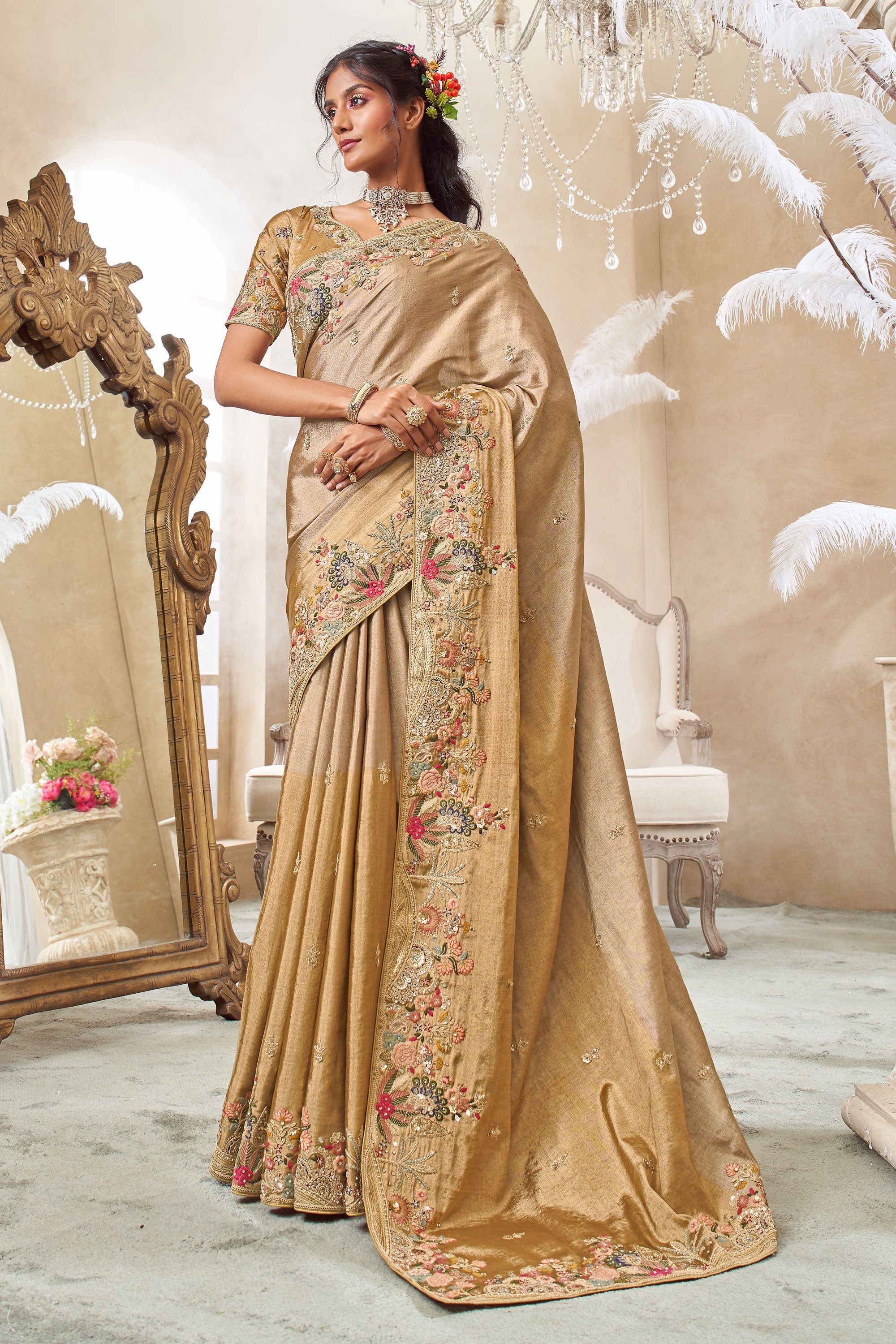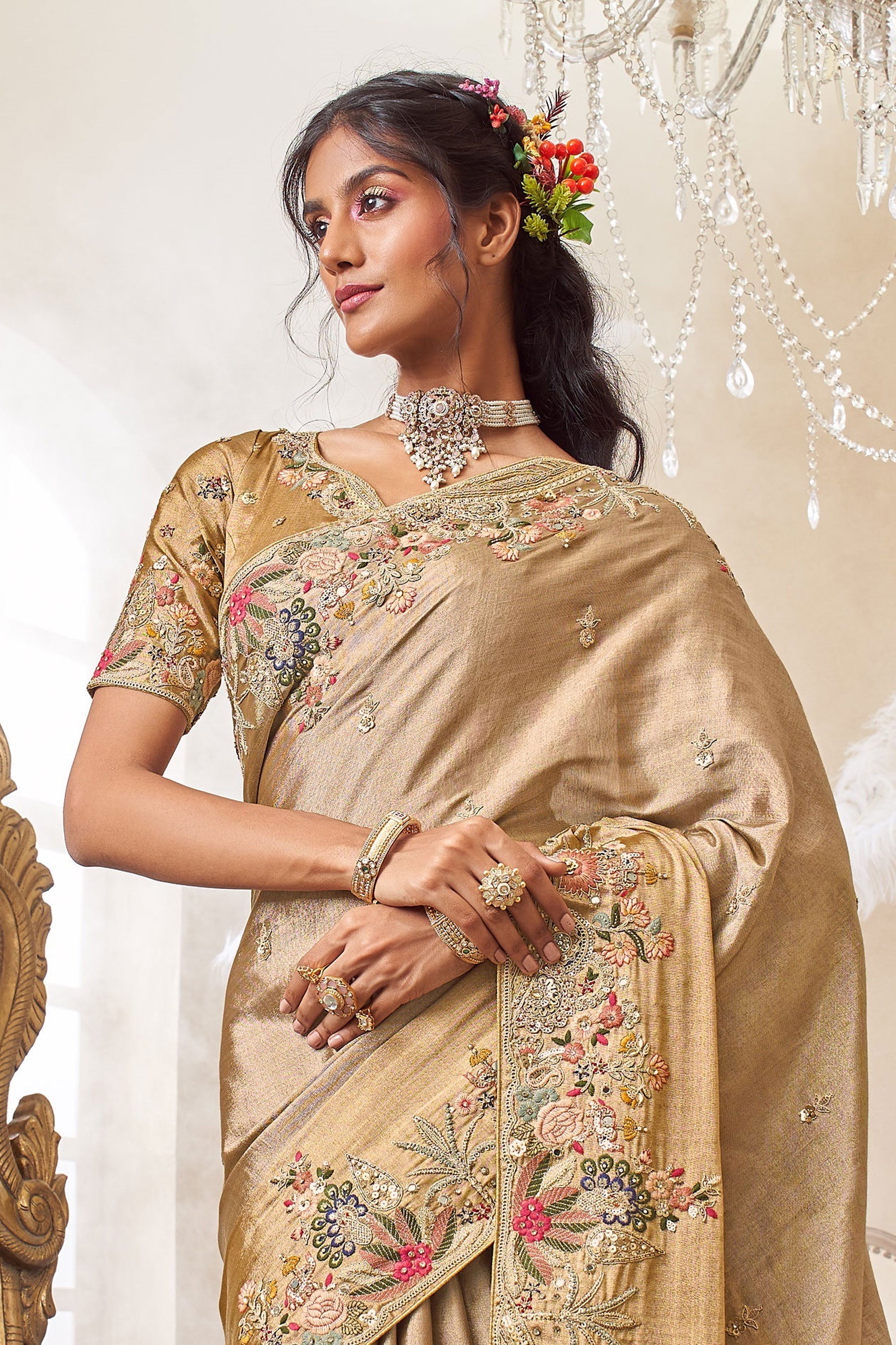 Viscose Silk Embroidered Beige Wedding Wear Saree