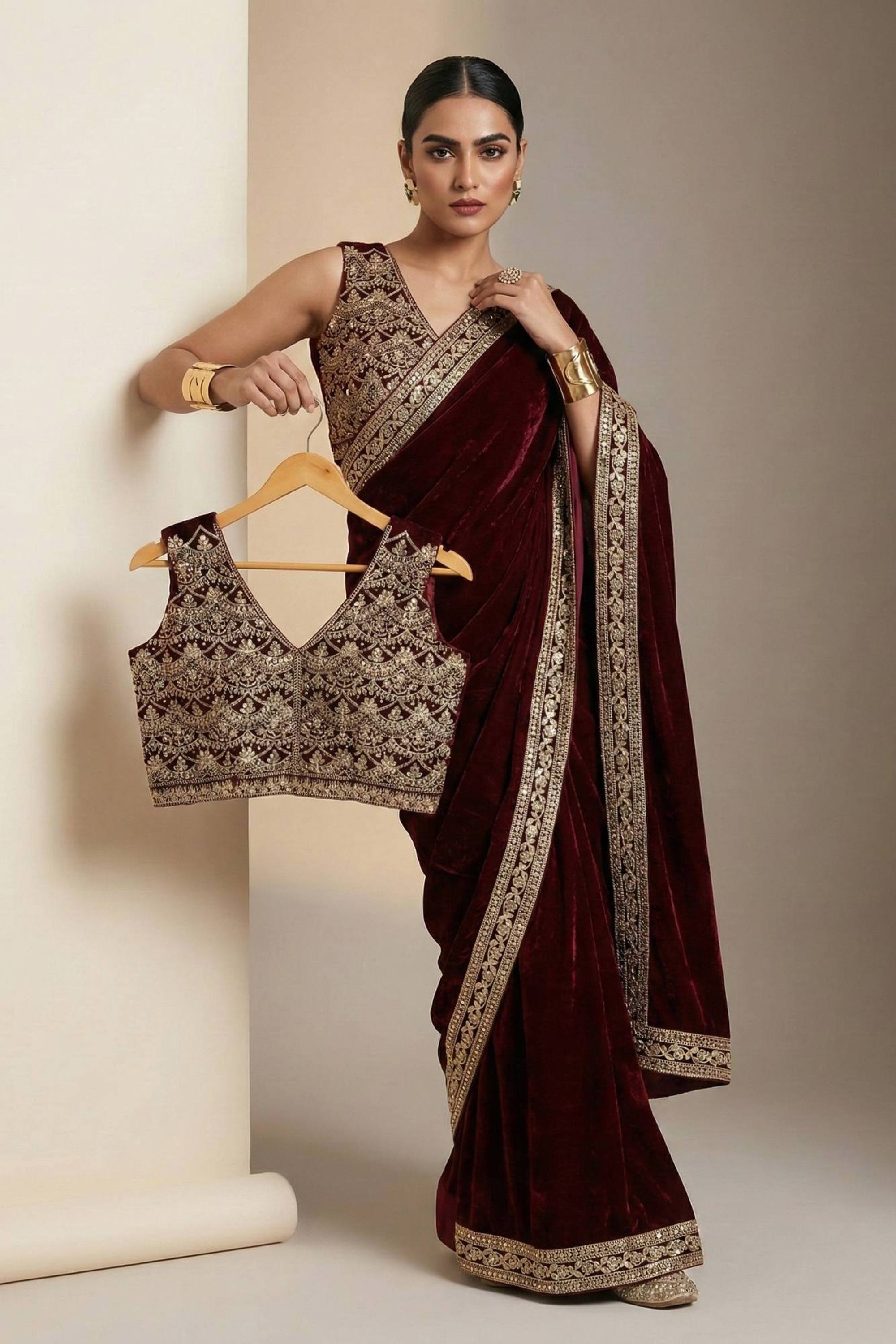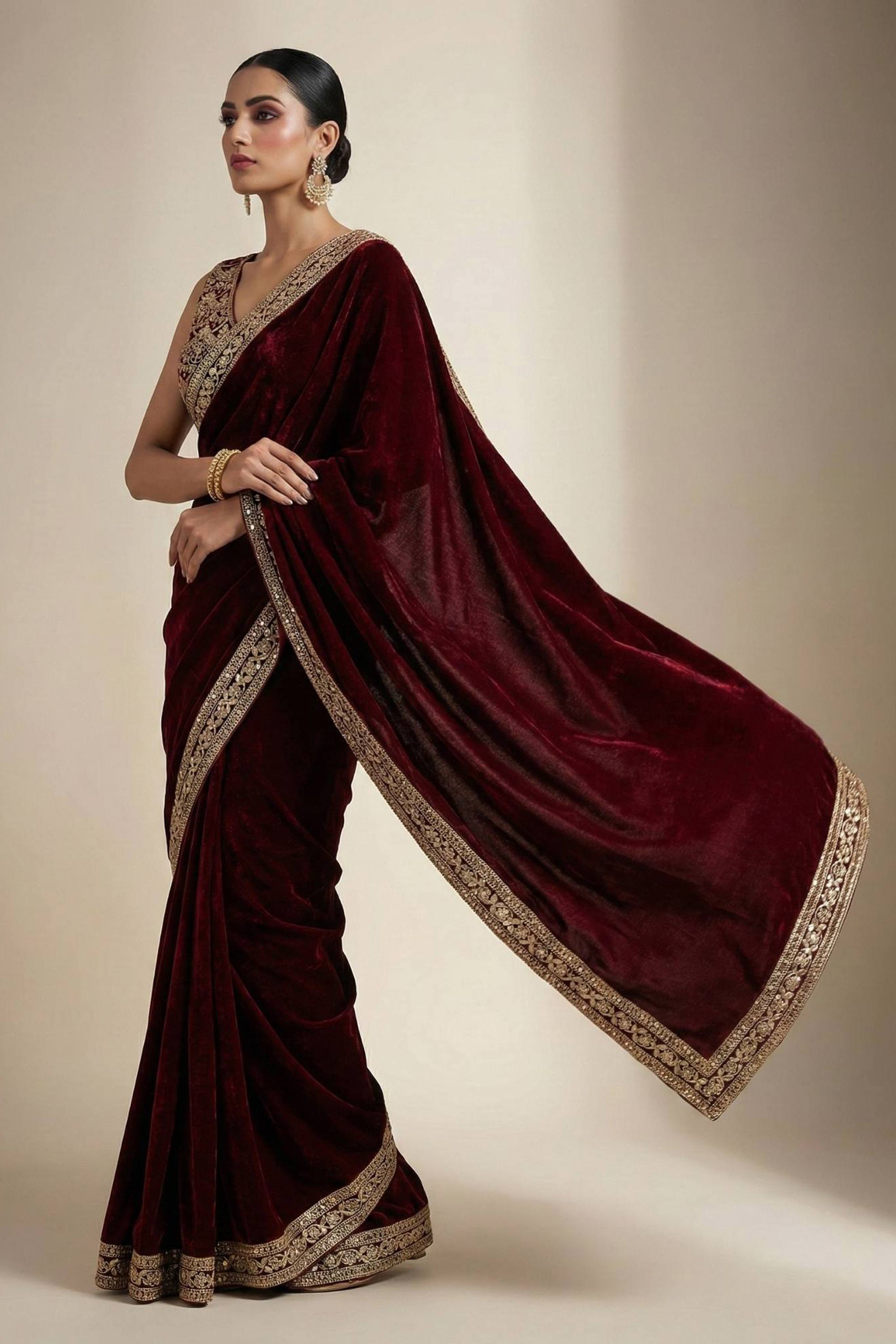 Viscose Velvet Border Work Maroon Party Wear Saree