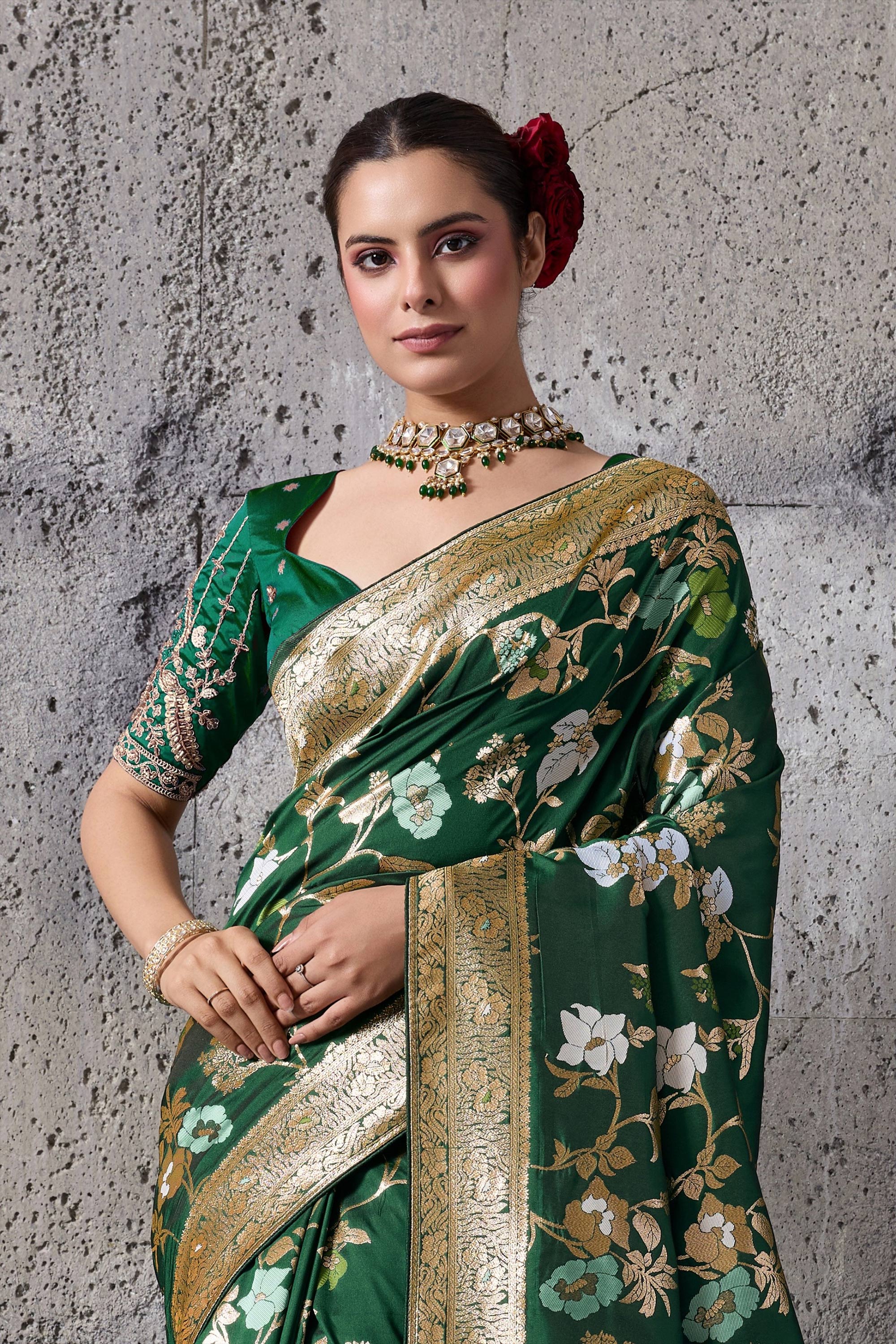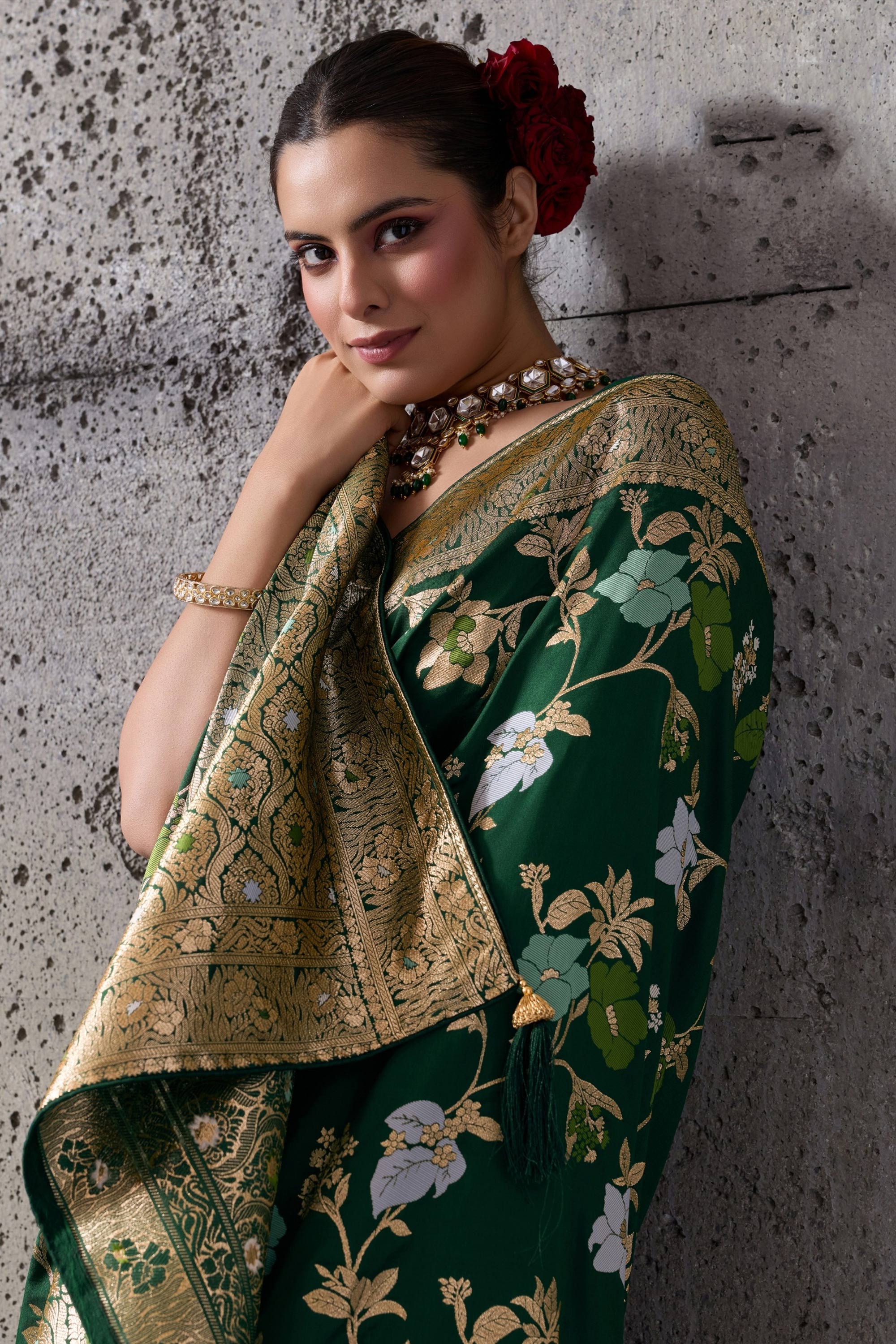 Weaving Work Art Silk Fabric Dark Green Saree For Wedding Wear