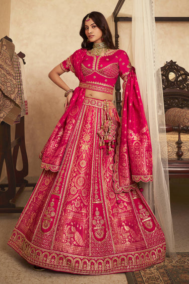 Weaving Work Banarasi Silk Lehenga Choli In Rani Color