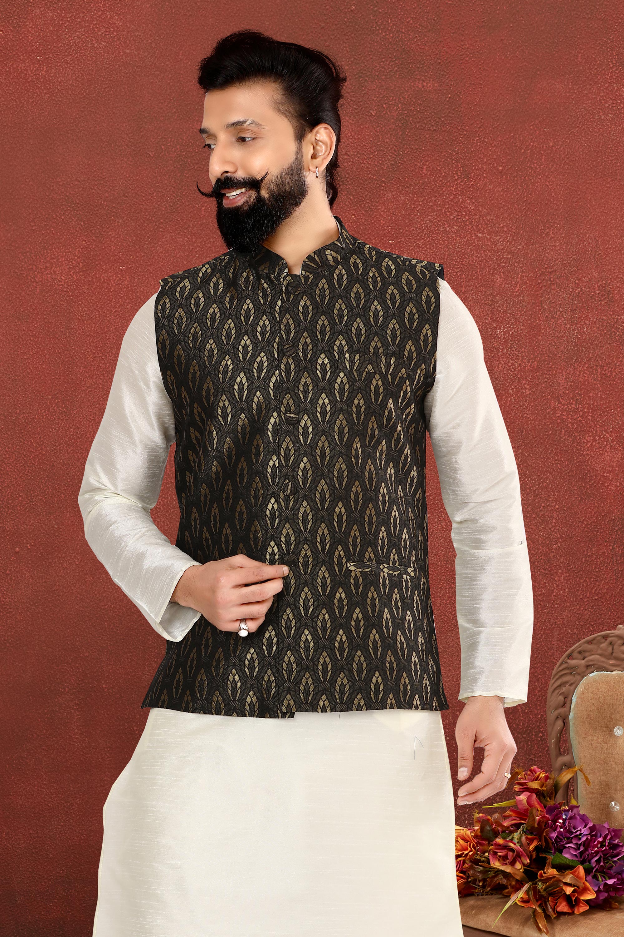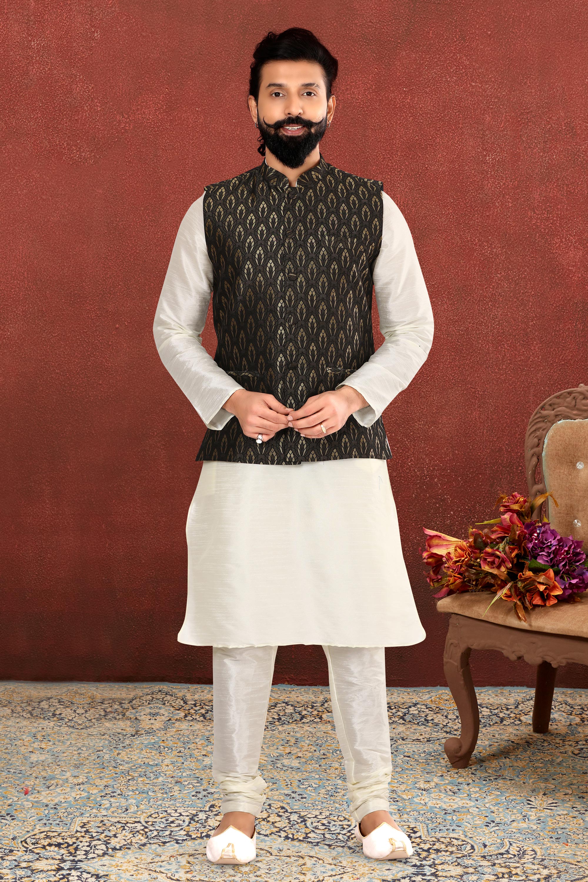 White Color Gorgeous Dhupion Silk Wedding Wear Readymade Kurta Pyjama For Men With Jacket