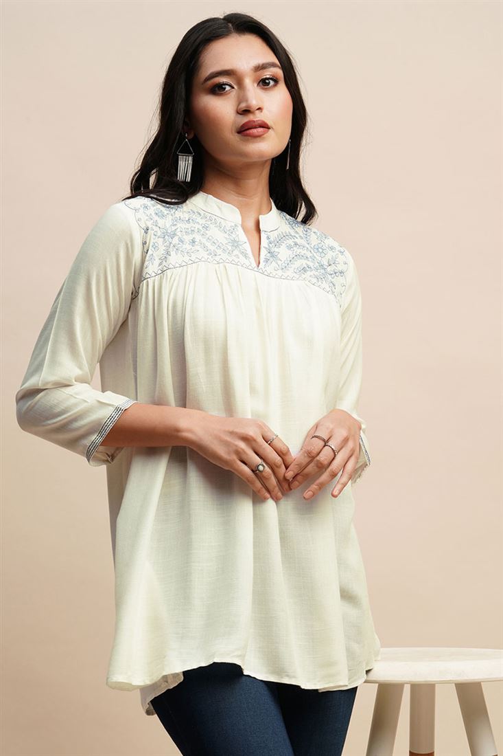 White Color Rayon Fabric Bewitching Embroidered Readymade Short Kurti