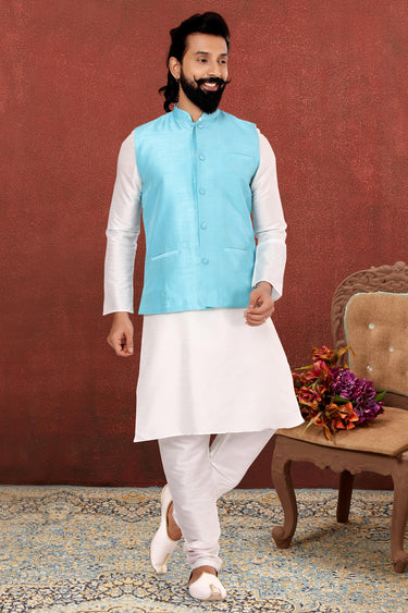 White Dhupion Silk Fabric Sangeet Wear Trendy Readymade Kurta Pyjama For Men With Jacket