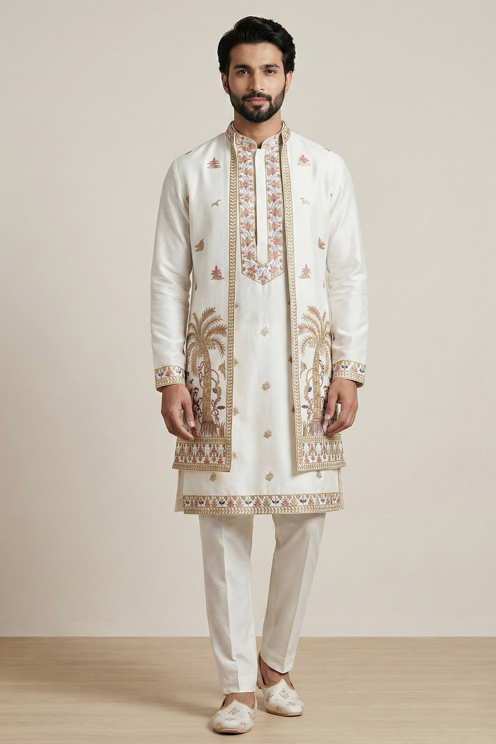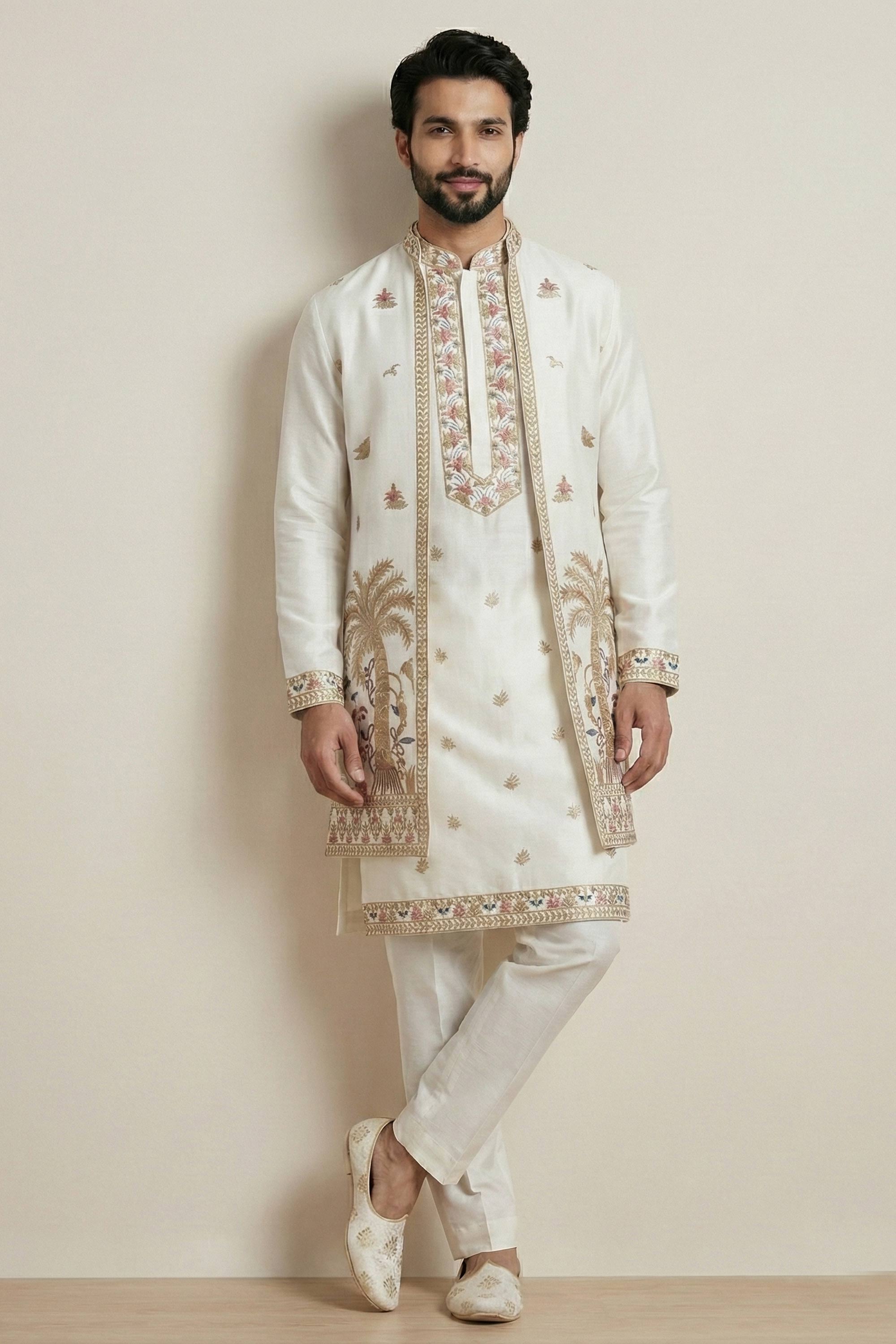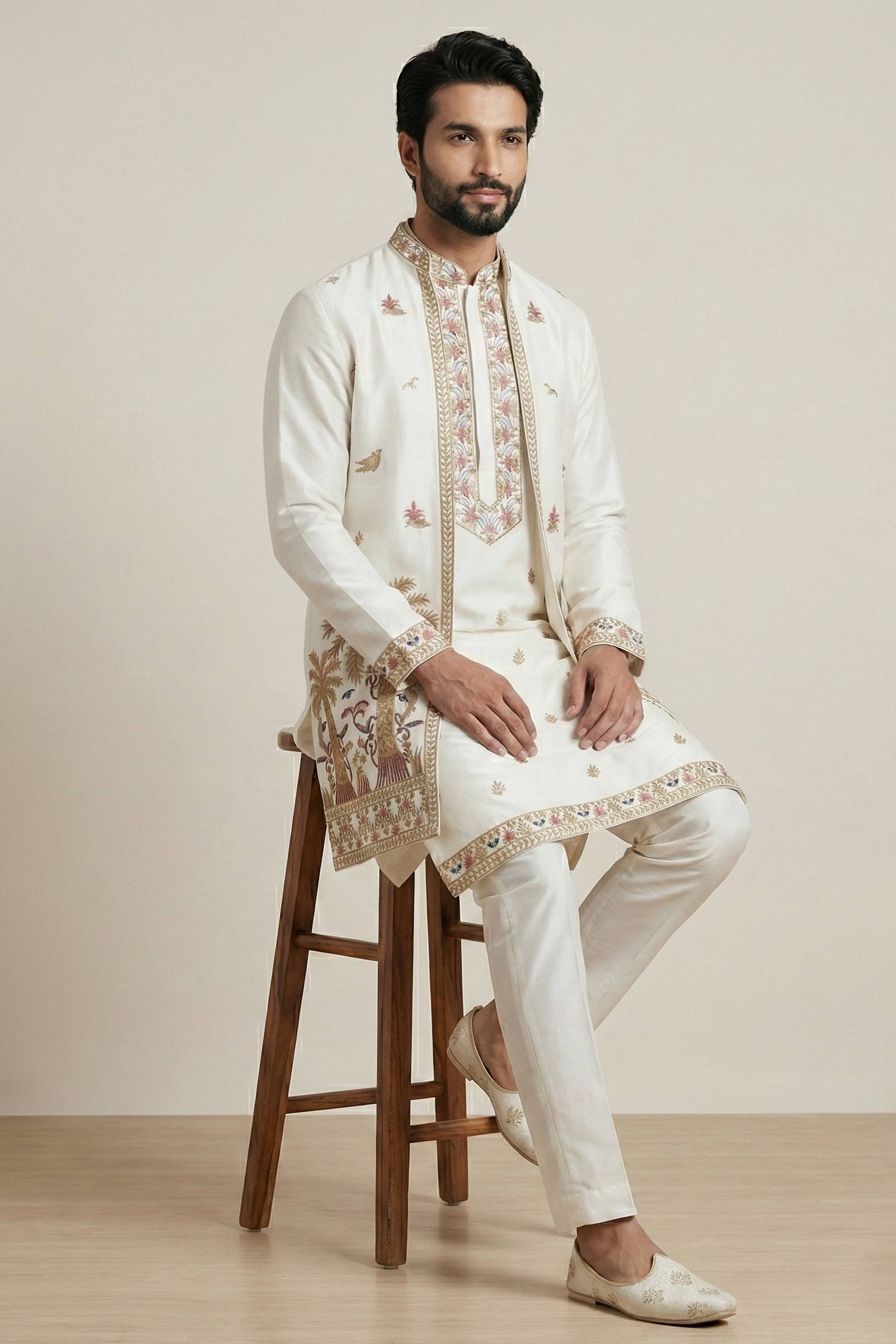 White Festive Wear Satin Embroidered Readymade Kurta Pyjama With Jacket For Men