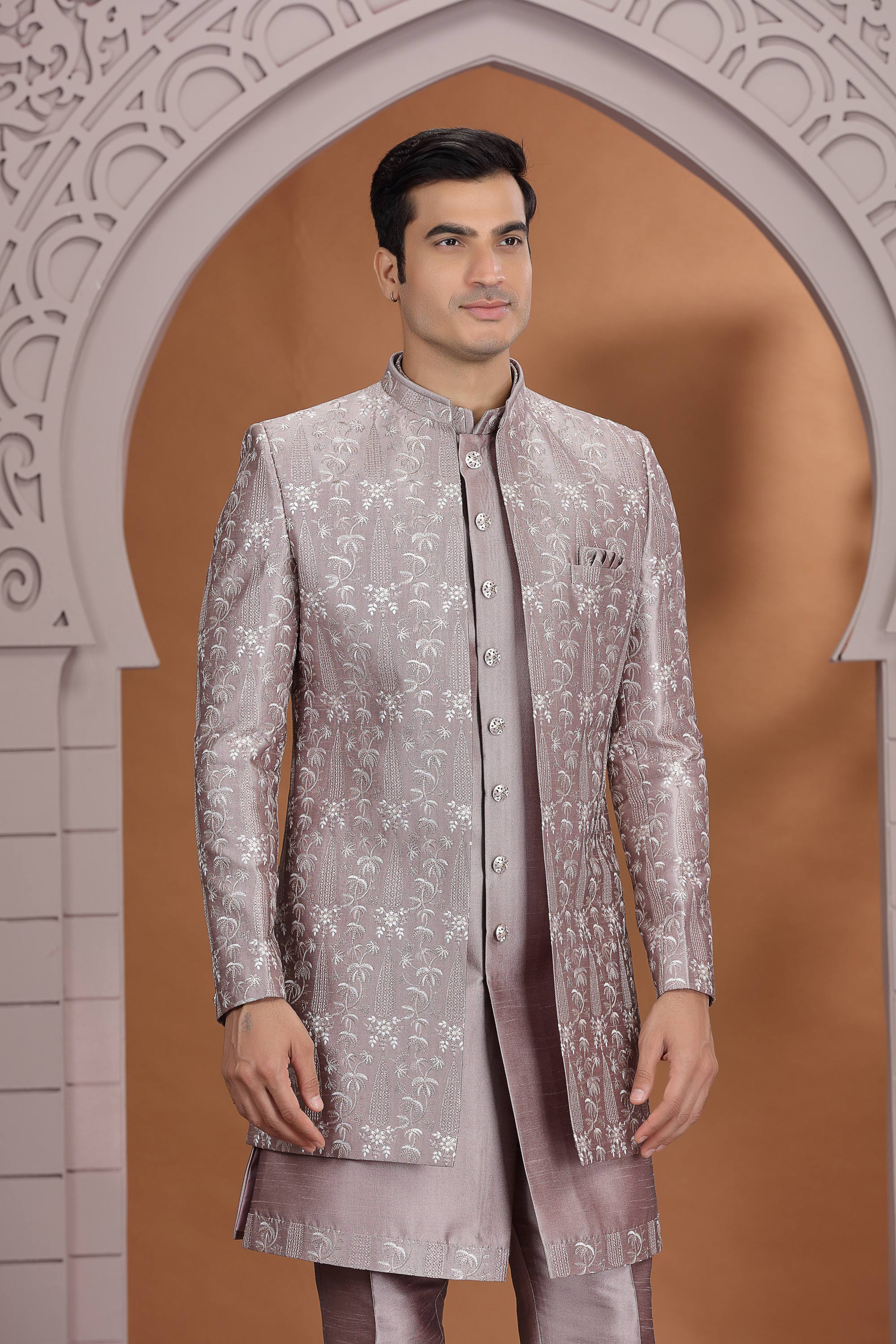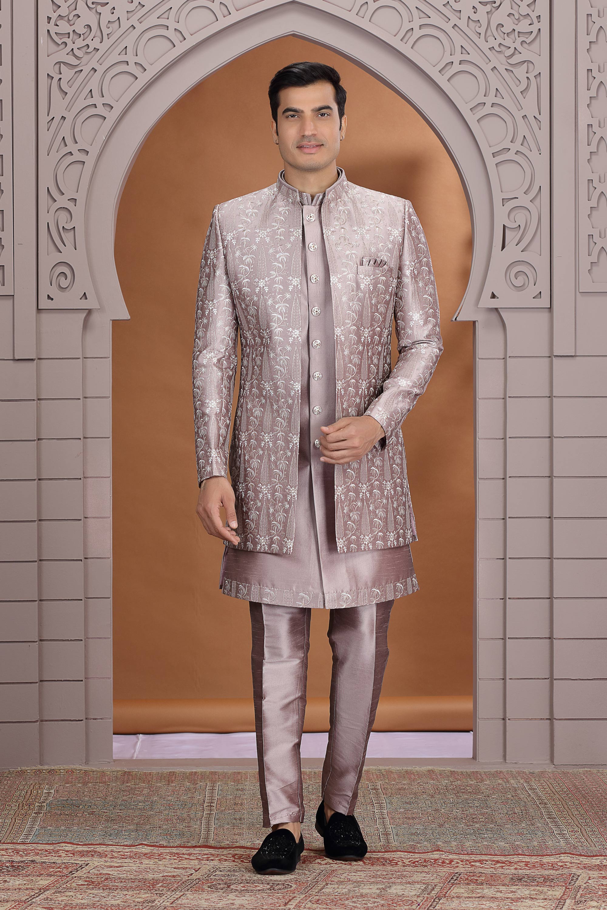Wine Art Silk Embroidered Readymade 3 Piece Indo Western For Men