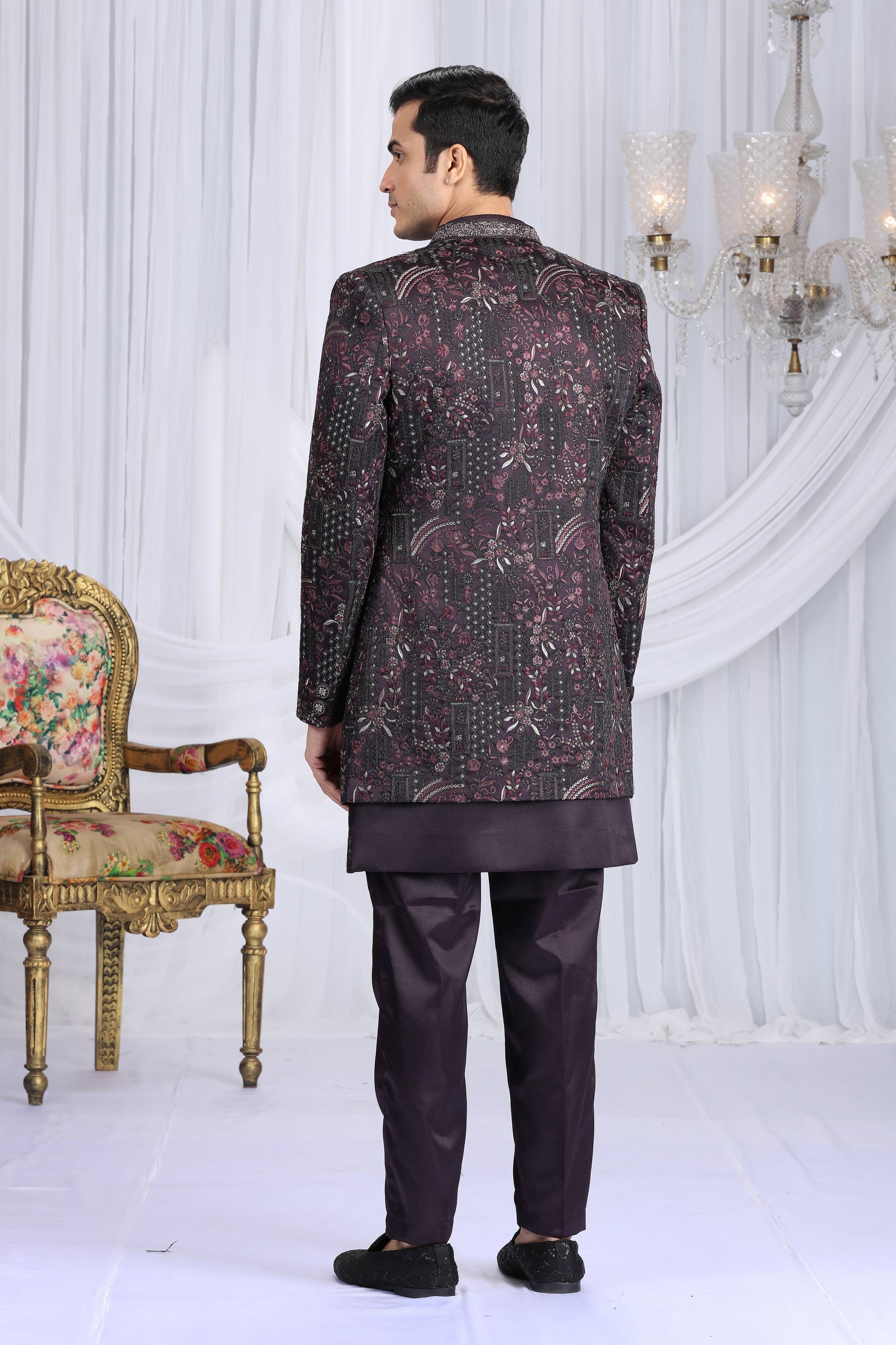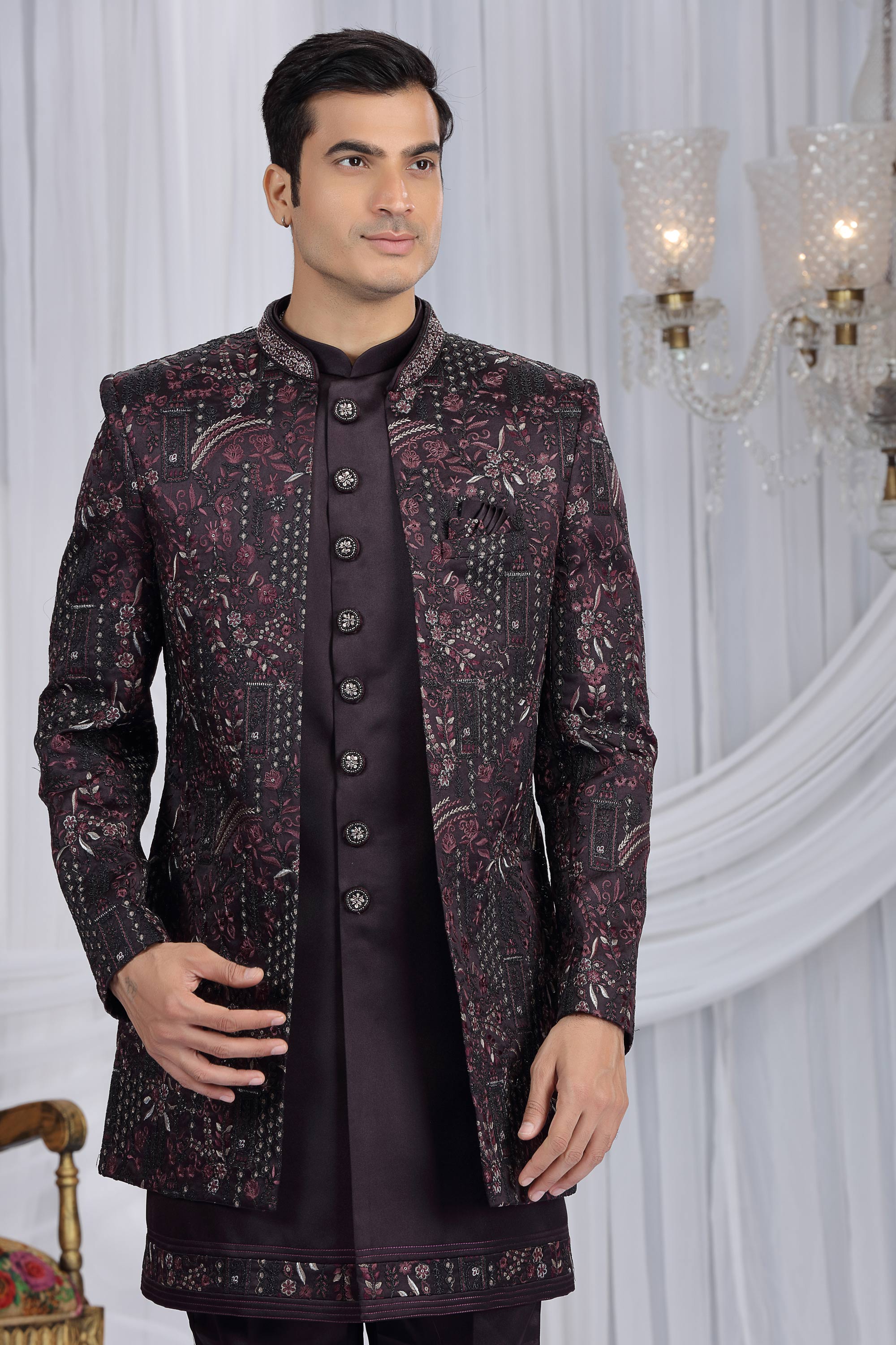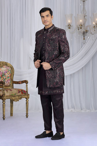 Wine Embroidered Wedding Wear Indo Western For Men