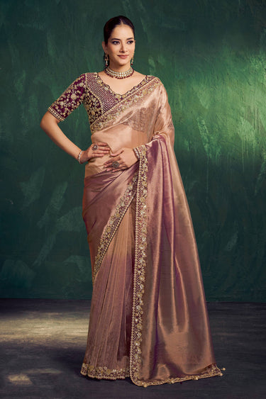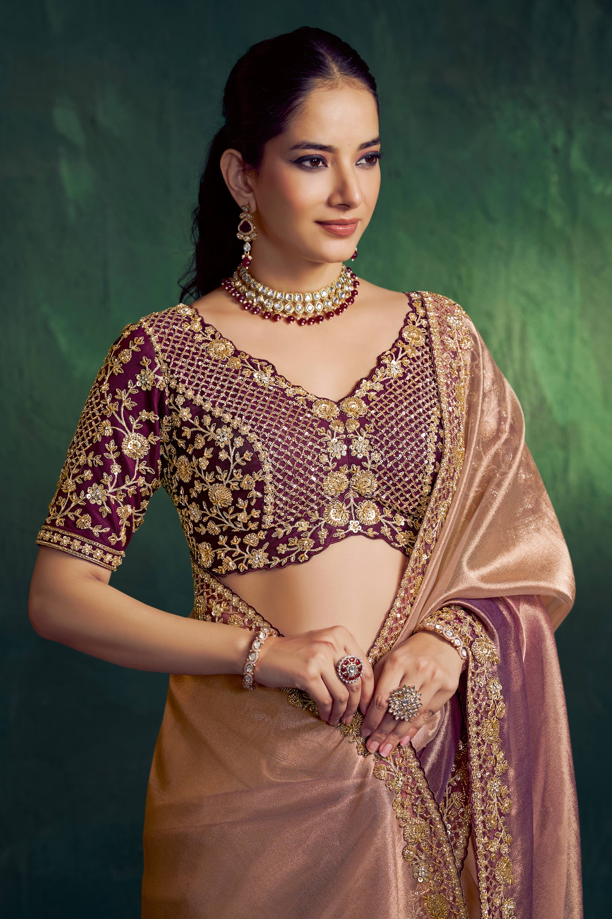 Wine Wedding Wear Tissue Silk Embroidered Border Work Saree