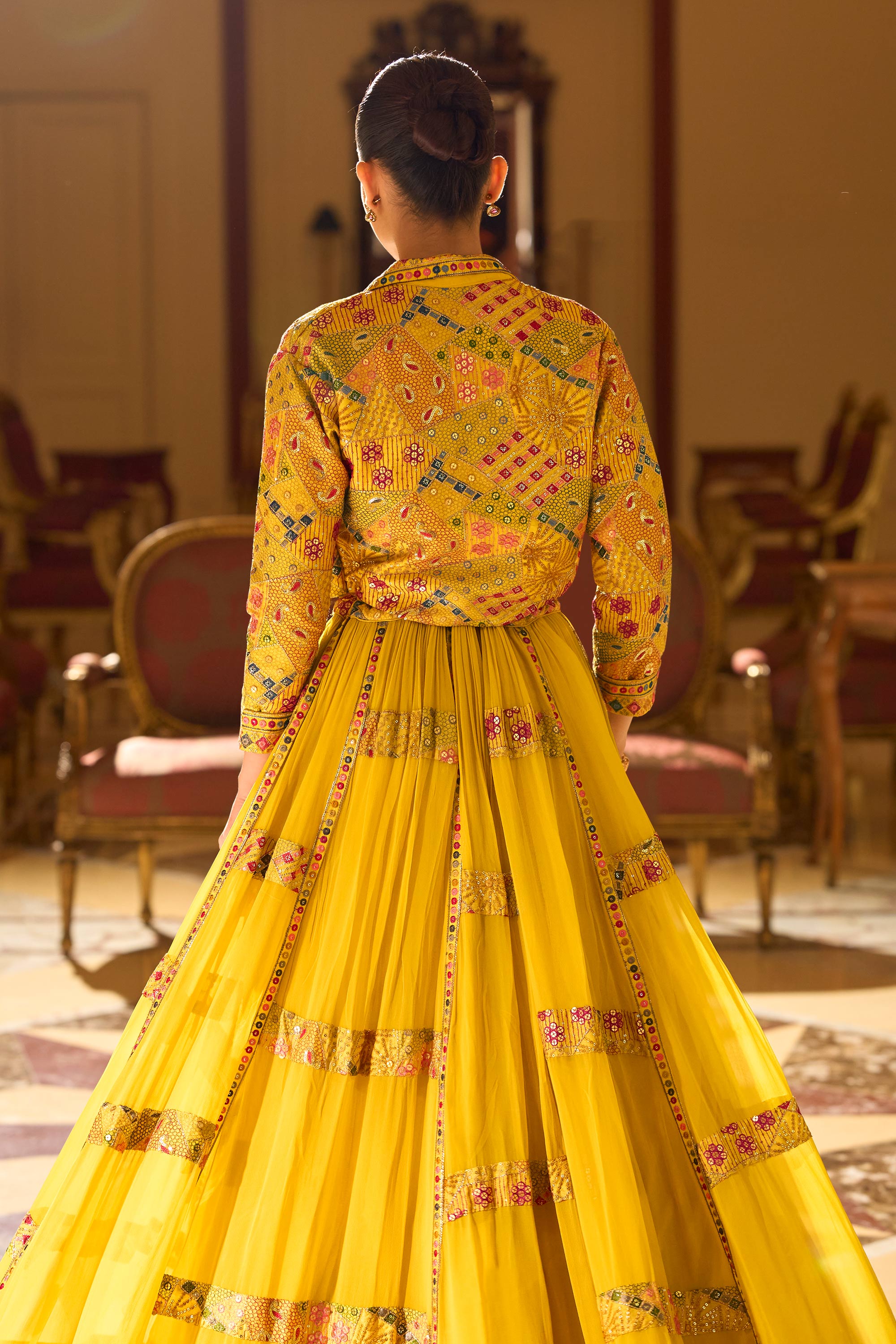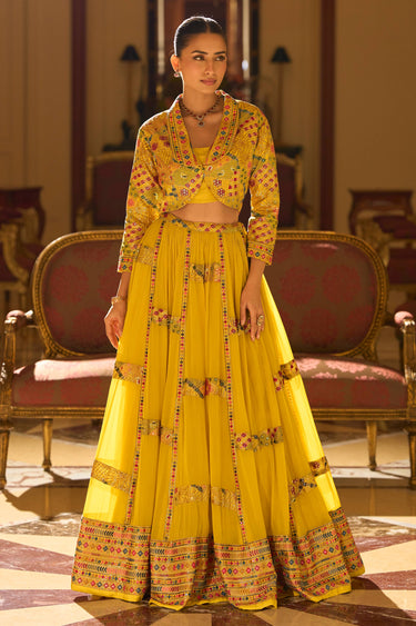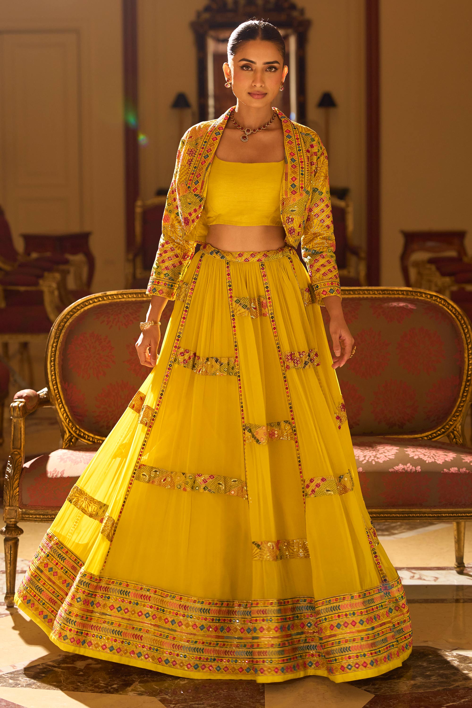 Yellow Georgette Readymade Embroidered Jacket Lehenga Set